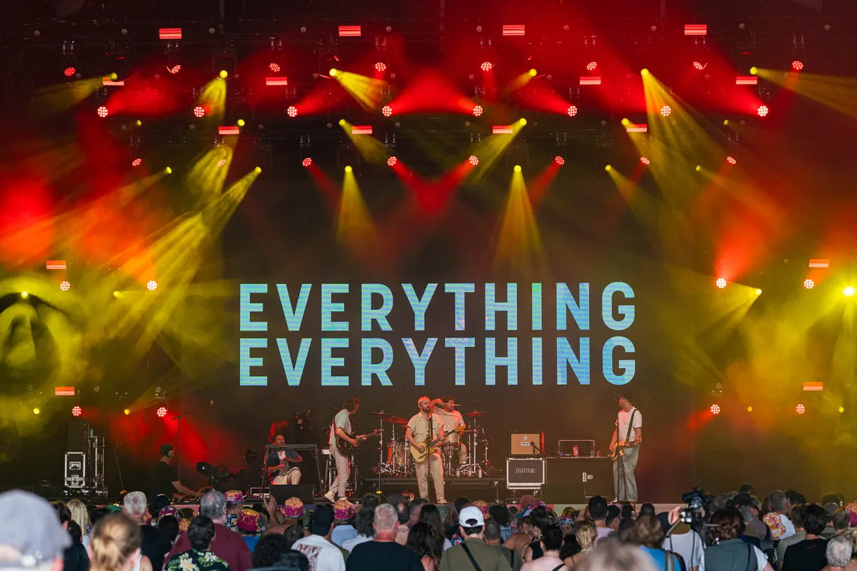 De Engelse band Everything Everything is er in hun vijftienjarige bestaan nog niet in geslaagd één liedje te schrijven dat zich in het collectieve geheugen van de festivalbezoeker heeft genesteld. Dat komt doordat ze alles net even anders willen doen dan je verwacht. Dat is natuurlijk meteen de charme van deze Mancunians, maar de eerste veertig minuten van hun Pinkpop-set wekken ze vooral ergernis door niets recht te zingen en alles op alles te zetten om vooral géén pakkend refrein te spelen.