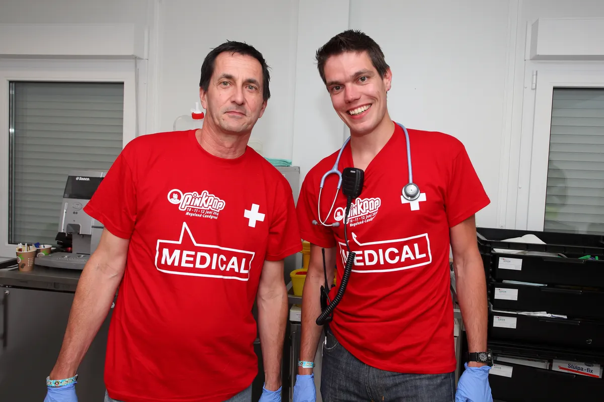 Rechts van de Brand Stage is het op de vrijdagavond redelijk druk met allerlei mensen met kleine pijntjes en wat grotere. Dokter Roy Salden (rechts op de foto) uit Stein is samen met Peter Smeets uit Heerlen onderdeel van een team artsen die iedereen ontvangt die bij de naastliggende portocabin wordt doorverwezen. Bij kleine hooikoortskwaaltjes als rode ogen hoef je je niet te melden bij de doktoren. 'Pas bij echt heftige allergische reacties zijn wij aan de beurt,' vertelt Salden. 'Dan zijn er drie maatregelen die we kunnen nemen: vernevelen met een astmapufje, antihistamines toedienen met een infuus, en als het écht mis is: prednison.'