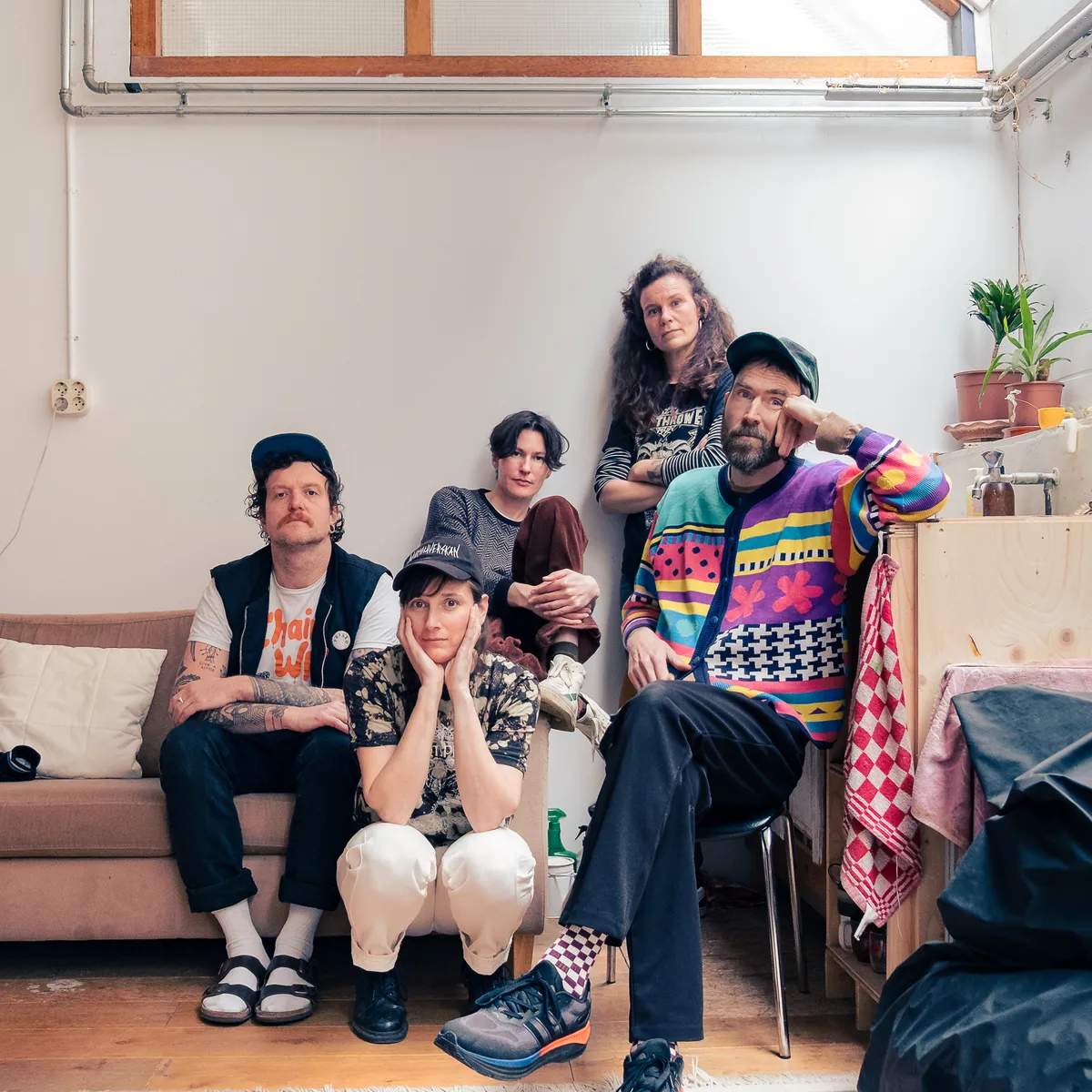 Het kan geen toeval zijn dat Dishes ontstond tijdens de pandemie, toen touragenda’s leegraakten en zelfs Shireen van Dorp ineens tijd had om iets voor zichzelf te beginnen. De band komt voort uit de Amsterdamse DIY-punkscene, de wereld van kraakpanden, sociale centra en geïmproviseerde podia. Vanuit een infrastructuur die niet draait op subsidieaanvragen of carrièreplanning, maar op vrijwilligers, vriendschappen en een gedeeld idee van hoe je samen iets in stand houdt. Van Dorp is zelf betrokken bij Plantage Dok, een sociale plek in Amsterdam die door de mensen zelf wordt gerund. Wat haar daarin aanspreekt, zegt ze, is dat mensen hun eigen sociale infrastructuur bouwen. ‘En dat je als groep veel meer macht hebt dan dat je denkt.’