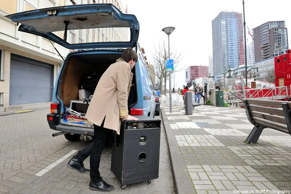 Geluidsman Chris van Velde heeft de bus intussen als een legpuzzel volgeladen en wij springen op de fiets. De tocht voert parallel aan de nieuwe Maas langs Rotterdamse geschiedenis als (het vroegere subtropisch zwemparadijs) Tropicana en - als David al telefonerend een afslag mist - Waterfront aan de Boompjeskade. We maken nog een slinger langs het Maritiem Museum en het beeld De Verwoeste Stad van Zadkine en arriveren bij de V11, het voormalige lichtschip in de Wijnhaven waar de albumpresentatie plaatsvindt. De rode boot herbergt ook een restaurant en met de goederenlift vol serviesgoed komen de spullen zo benedendeks op de houten vloer terecht. Daar heeft V11, vanavond uitgebaat door Rotown en Motel Mozaique, een podium opgebouwd. Iets wat volgens Van de Velde het geluid ten goede moet komen. "Bij de soundcheck voor de singlepresentatie van Powder Monkey hoorde je de gitaren heel schel en toen het vol stond met publiek hoorde je helemaal geen gitaar meer..."
