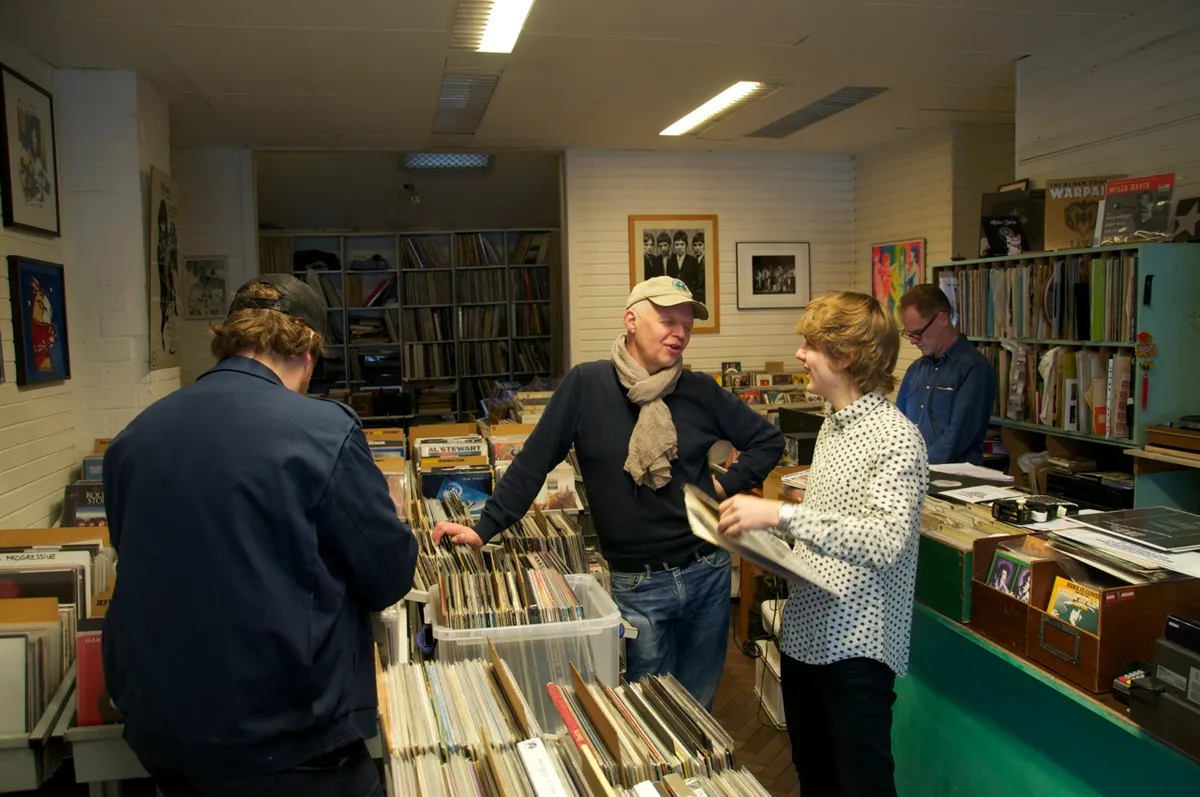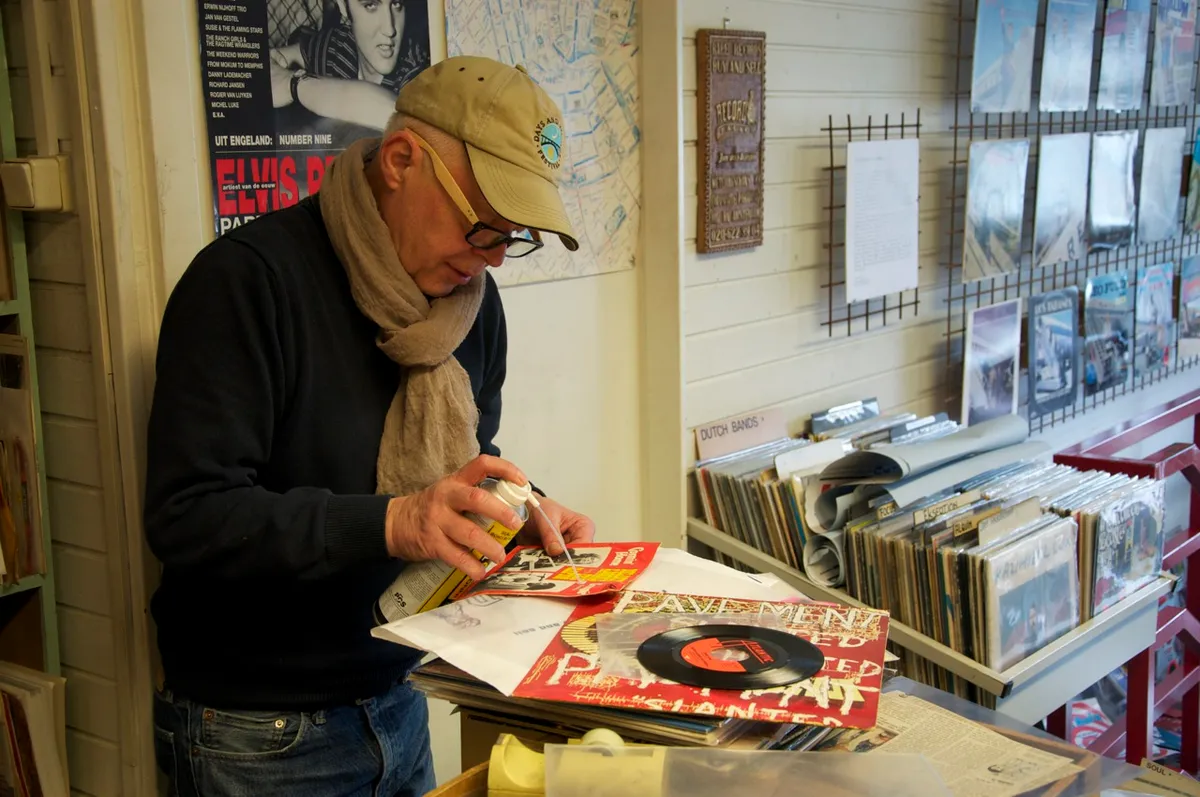 Tim Knol is al aanwezig in Record Palace, Kees Schaper laat nog even op zich wachten. Met eigenaar Jan van Dorsten bespreekt Knol de nieuw binnengekomen platen en de mysterieuze Japanse handelaar die er geregeld over de vloer komt. Knol kwam hem onlangs tegen in Gent. Van Dorsten: “Dan had je hem even aan moeten spreken, had hij harstikke leuk gevonden. Binnenkort komt hij weer, hij gaat altijd alle platenzaken in Nederland af in een paar dagen.” Dan arriveert Kees Schaper, de drummer van The Miseries en van Tim Knols tourband en bovendien groot vinylverzamelaar. Vorig weekend werkte hij zelfs een paar dagen in de zaak, toen Van Dorsten op de platenbeurs stond. Zowel Knol als Schaper treedt ook graag op als dj. Tijd om door de bakken te gaan. Na een klein half uur bekijken we de oogst. Schaper en Knol moeten hard lachen om de hoes van Everly Brothers – Roots. Knol: “Die broek. Het lijkt wel alsof hij schaamlippen heeft.” Schaper: “Zo’n hoes zou je tegenwoordig toch niet meer mogen uitbrengen?”