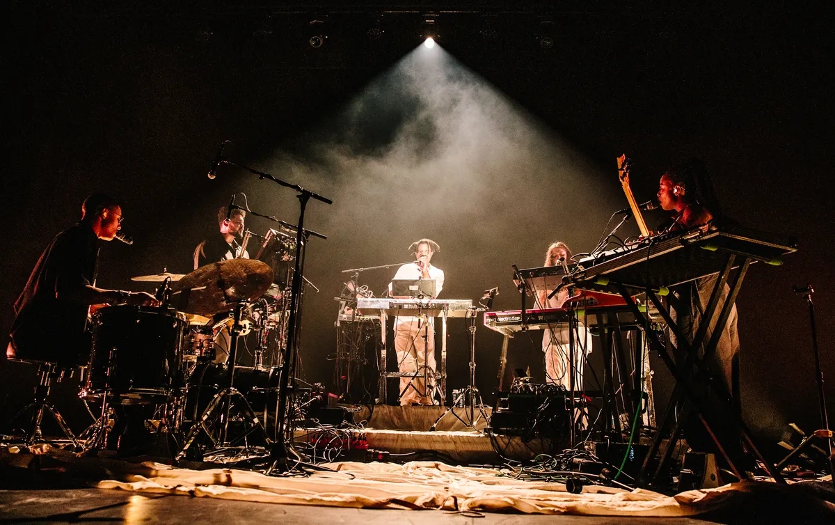 Oh Sampha, wat zet je met je band een onwijs Muzikale show neer, met een hoofdletter M. Neem ‘Stereo Colour Cloud (Shaman’s Dream), een van de allermooiste liedjes van zijn tweede album Lahai. Met z’n complexe jungle-breakbeats en razendsnelle minimal-piano-arpeggio’s een vrijwel onmogelijke compositie om live te spelen. Zou je zeggen, toch? Maar met vier bandleden in een cirkeltje naar binnen gericht op het grote podium van Carré – dat er vandaag wel heel sober bijligt met wat spots op de band – weten ze het nog mooier uit te bouwen. Vooral die drummer (met z’n rug naar het publiek gekeerd zodat je hem continu op de vingers kan kijken!) is een totale virtuoos, die tegelijkertijd met dezelfde hand rimshots slaat en met de vingers op het vel trommelt, en de rest van de groep dubbelt als vierstemmig achtergrondkoor terwijl ze een muzikale stoelendans doen met allerlei synths, percussie en zelfs triangel.