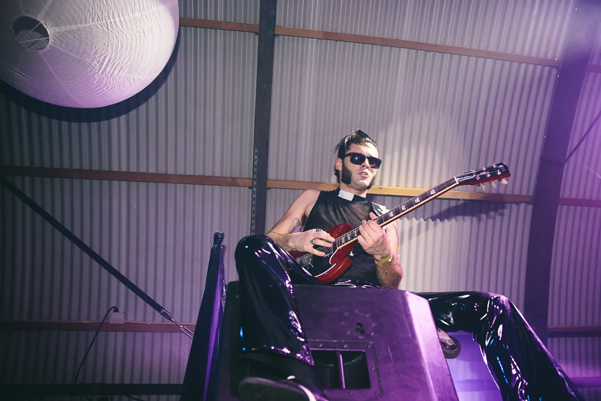 Op welk festival zie je nou nog strippers tussen de glitterslingers, muzikanten die elkaar on stage baffen, en heel veel leer en zweet? Er zijn maar weinig rock 'n roll-feestjes zo opgewonden als Sleazefest, het halfjaarlijkse feestje van zZz met een overdaad aan garagerock, exotica en punk, dat steevast ontspoort. Een fotoverslag.