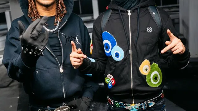 Voor de feature dacht hij meteen aan ADF Samski. Leuk hoe de videoclip met AI volledig aan de haal gaat met hun teksten:‘Ik kom in de nieuwste gear, net Tony Stark,’ zegt Samski daarin, om door middel van AI in Iron Man te transformeren en vervolgens weg te vliegen. ‘We wilden allebei een AI-videoclip, zo lelijk mogelijk en shit. We hebben daar ook de tekst op geschreven. Het is een brag tune, maar het gaat ook over fake shit.’ Een van de lines die eruit springt is ‘Hoezo drinken n** matcha?’* Lachend vervolgt hij: ‘Het was een hele wave aan mannen die ineens matcha gingen drinken… Sam en ik dachten gewoon: laat de dames ook wat hebben. Ik hou van mijn performative males, maar dit ging even te ver.’