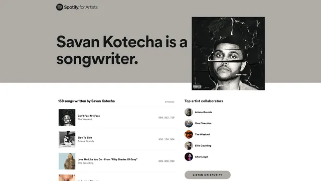 Spotify heeft speciale pagina’s geïntroduceerd voor songwriters. Voortaan kun je dus op de streamingdienst niet alleen de songwriter-credits van nummers bekijken, maar via die credits ook doorklikken naar de profielen van auteurs en zo meer van hun nummers ontdekken. Ga maar eens naar ‘break up with your girlfriend, i’m bored’ van Ariana Grande. Dan kun je klikken op de naam Savan Kotecha, om er op zijn eigen profiel achter te komen dat hij bijvoorbeeld ook ‘Can’t Feel My Face’ van The Weeknd, ‘Love Me Like You Do’ van Ellie Goulding en ‘How Do You Sleep’ van Sam Smith heeft geschreven, en zijn songs goed zijn voor tientallen miljarden streams. Veel grote songwriters bleven voorheen nogal anoniem, hiermee lijkt daar enige verandering in te komen.
