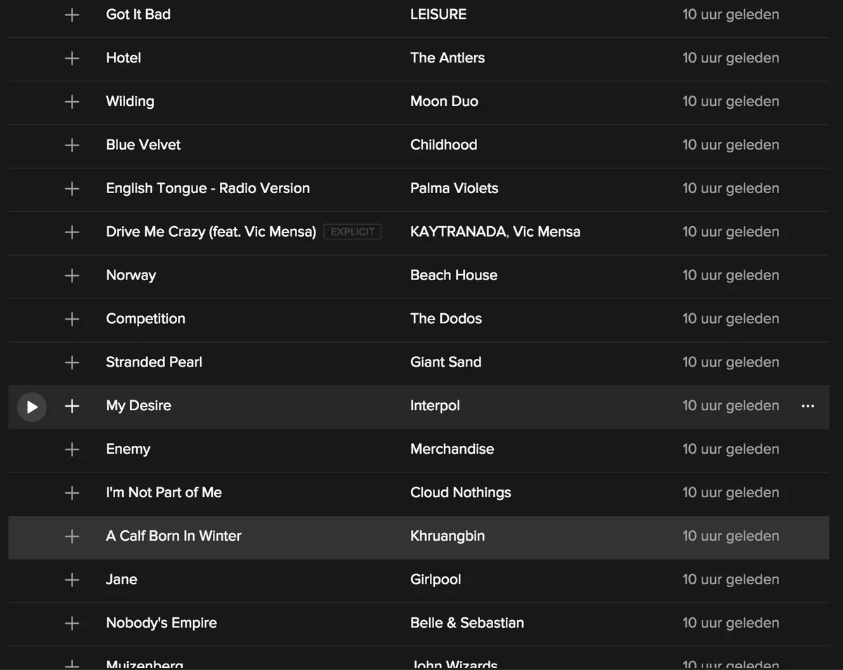 Bij 3voor12 op de redactie hebben we onze persoonlijke playlists naast elkaar gelegd. Kaputt van Destroyer, Jane van Girlpool, Drive Me Crazy van Kaytranada en twee verschillende nummers van Whilk & Misky verschenen bij meerdere redactieleden in de playlist. Ook duikt er opeens een track van de Romeo & Juliet soundtrack uit 1996 op en een mislukte soundalike van Young Folks van Peter, Bjorn & John. De track Nissim, een oud nummer van The Gaslamp Killer, valt dan wel weer in de smaak.