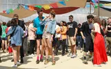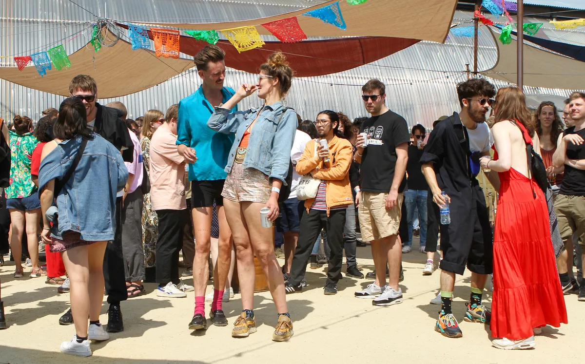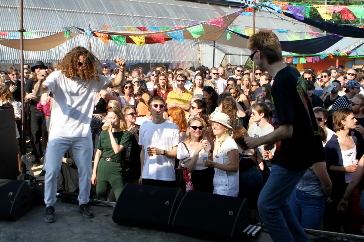 Klinkt dat als incrowd? Een beetje wel natuurlijk. Strange Sounds is een ontmoetingsplek voor kleurrijke mensen met spectaculaire outfits. Waar Basquiat T-shirts met panterleggings een uitstekende combi zijn. Waar hoge roze sokken onder een open blauw shirt en een snorretje uitstekend blijken te staan. Waar iedereen die ooit een dag bij Rush Hour achter de toonbank gestaan heeft de hele dag present is. En terecht, want het is een fabuleuze festivaldag met ideaal weer. Waarom zou je niet naar de NDSM werf komen.
