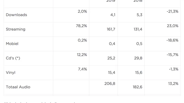 Ook in 2019 noteerde de plateindustrie een flinke groei. De omzet nam met 13,2% toe, de sterkste omzetgroei in vijf jaar tijd. Dat blijkt uit nieuwe jaarcijfers van branchevereniging NVPI. De industrie zit de laatste jaren flink in de lift dankzij de doorbraak van streaming muziek. De groei van dat segment van de markt steeg met 23% en is nu goed voor maar liefst 78% van het totaal.