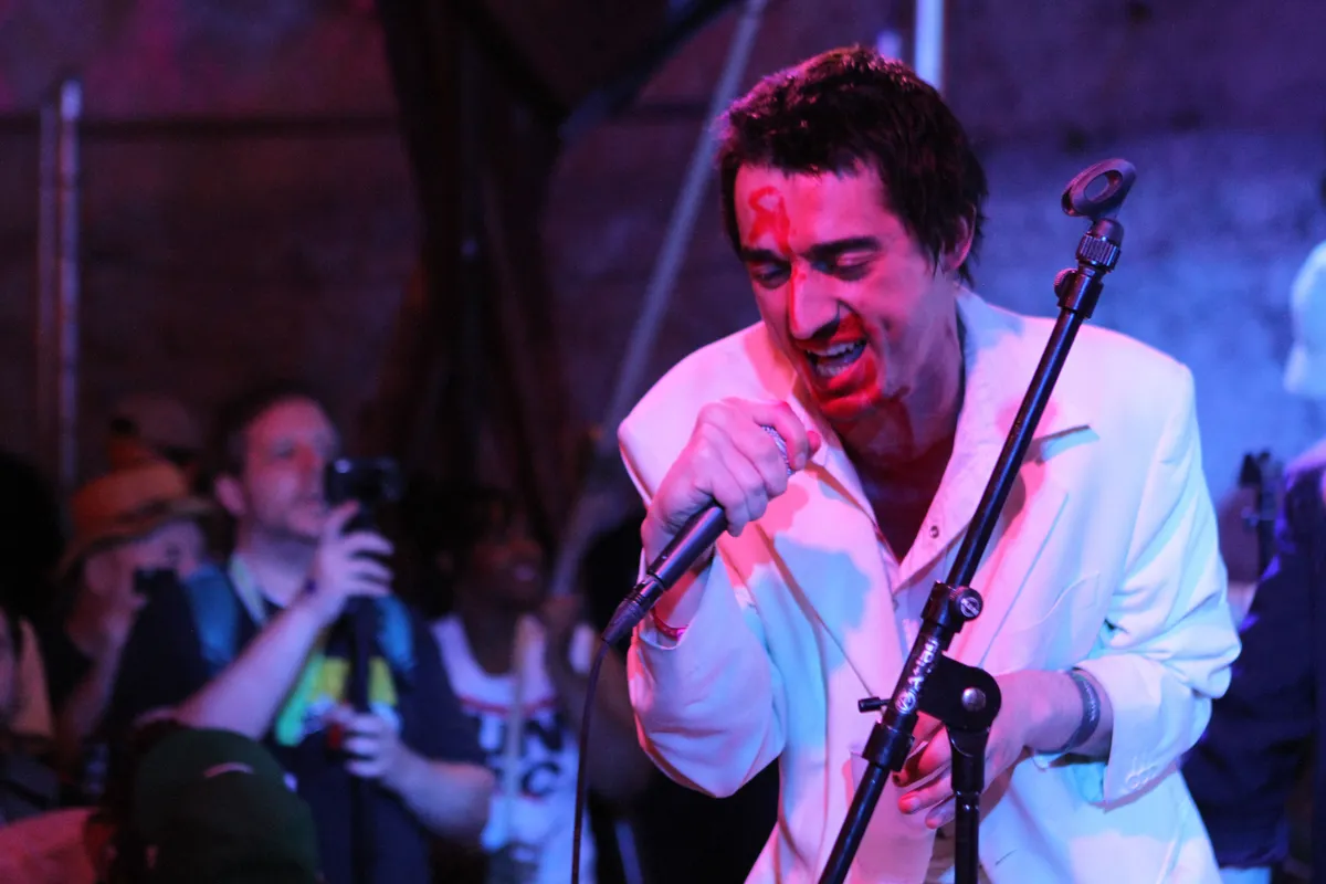 Als we af mogen gaan op hun nieuwe album, gaat het niet zo goed met de Fat White Family. Nou was het altijd al een zwalkend gezelschap met de nodige complexen, maar dat tweede album is ronduit het meest miserabele album van het jaar. Maar zoals het cliché vaak zegt, zorgen de foutste drugs wel voor de meest onnavolgbare creatieve uitingen. Neem nou The Moonlangdingz, een zevenkoppig gezelschap geleid door Fat White frontman Lias Saoudi, die ondanks zijn naam zo Engels is als maar kan. Nou ja, geleid: de frontman staat het grootste gedeelte van de show in het publiek, zijn witte pak steeds verder uit trekkend. Zijn voorhoofd, neus en kin zijn bloedrood geverfd. Het is vermoedelijk het resultaat van het fictieve verhaal dat aan The Moonlandingz ten grondslag ligt, over een obsessieve fan die een band stalkt. Een meisje neemt haar rol serieus en begint de tollende frontman te volgen op zijn baan door het publiek, inclusief provocerende duwtjes die schijnbaar geen enkele indruk maken. Ondertussen speelt de band op het podium behoorlijk solide door. Belangrijkste troeven in de band zijn twee toetsenisten, waarvan er een kleine melodietjes strooit, de ander spacegeluiden, om de naam maar te rechtvaardigen. Ook cruciaal is de dame op slippers in 80s colbert, die backing vocals schreeuwt. Het klinkt zo op papier nogal chaotisch, maar op zijn beste momenten heeft The Moonlandingz een super goeie punky-krautgroove te pakken. Detail: Sean Lennon bemoeide zich in de studio ook met The Moonlandingz, maar hij maakt geen deel uit van de band die we hier op het podium zien.
