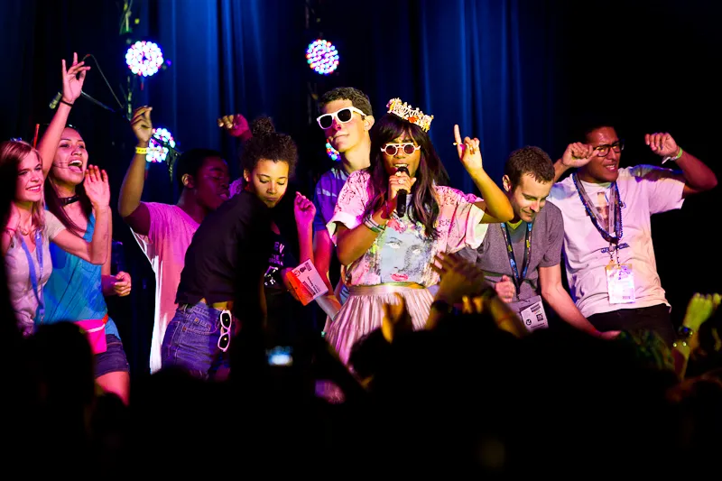 De rij staat tot ver voorbij de hoek. Niet alleen staan de locals in de rij voor Santigold, ook de Amerikaanse hiphop hipster Theophilus London is hier mateloos populair. Maar eerst moeten we ons door nog twee voorprogramma's heen worstelen. Over de Britse zangeres Neon Hitch kunnen we kort zijn.