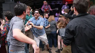In Stubb's, een van de meest aansprekende venues van SXSW, is in principe niets te merken van wat er buiten gebeurd. Blur-frontman Damon Albarn moet eigenlijk om half 1, rond het moment van het incident, aan zijn showcase beginnen, maar hij laat lang op zich wachten. Pas tegen half twee zijn de strijkers en het koor gesoundcheckt, en dan begint Albarn aan een raar, rommelig optreden. Albarn komt binnenkort met een soloplaat, die hij met een ambitieuze band wil vertolken. Er staan ook andere liedjes uit zijn repertoire op het podium, maar de grote hits vermijdt hij nadrukkelijk. Sterker nog: de zanger lijkt de zeurderige kant van zijn oeuvre te willen benaderen, in plaats van het speelse, jongensachtige. Albarn mompelt iets over waarom het zo lang duurde - het lijkt niet te maken te hebben met het incident voor de deur - en moppert even voor twee uur dat hij in verband met de curfew nog maar drie nummers mag spelen. De vraag is vooral of Albarn het zich niet gemakkelijker gemaakt had door in kleinere bezetting op te treden, zeker op een showcasefestival als dit. De strijkers en het koor hebben niet de meerwaarde waar je op zou hopen, en hij komt hier over als een verveelde chagrijn. Dat vindt hij zelf kennelijk ook, want direct na zijn optreden biedt hij op het podium zijn excuses aan. "We spelen nog een keer, en dan hebben we hopelijk meer controle over de show." Een merkwaardig einde aan een toch al rare avond. (Atze de Vrieze)