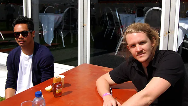 De Australische band The Temper Trap staat dit jaar voor het eerst op Pinkpop. Het succes van het afgelopen jaar bracht de band veelvuldig naar Europa. Zanger Dougy Mandagi en bassist Jonathon Aherne maken een ietwat vermoeide indruk.