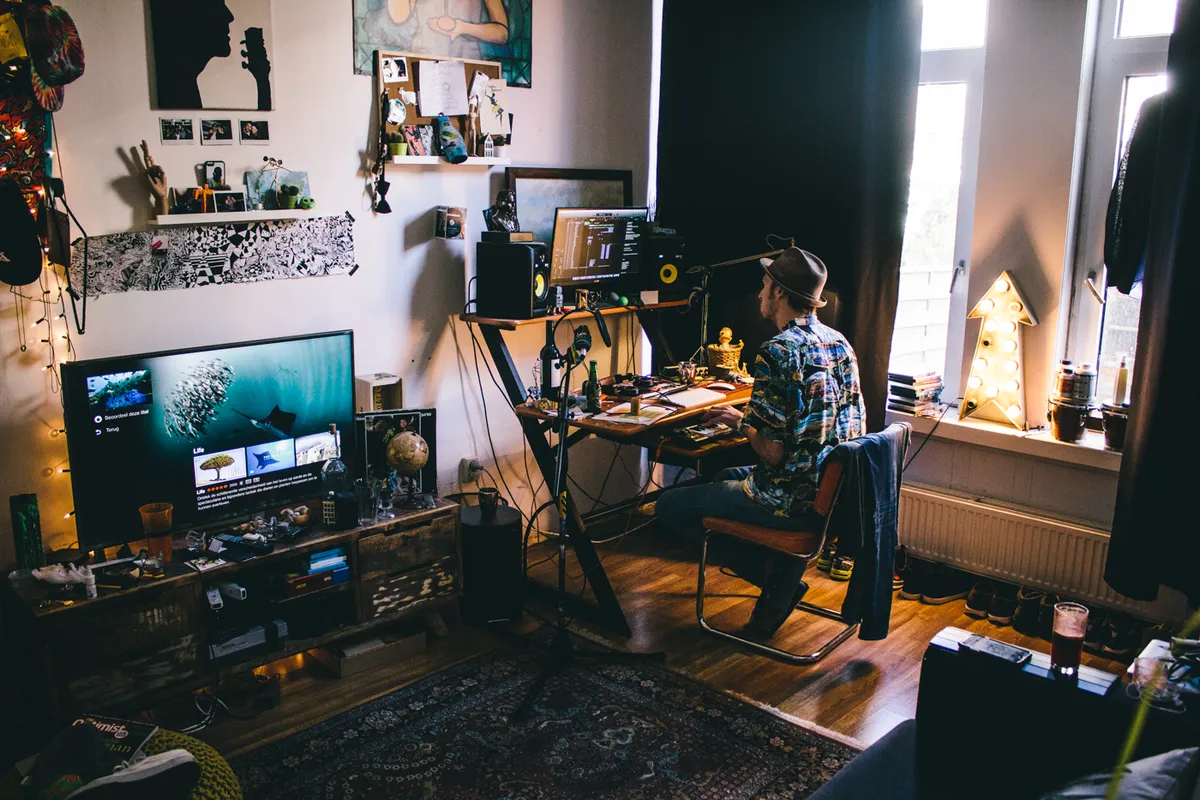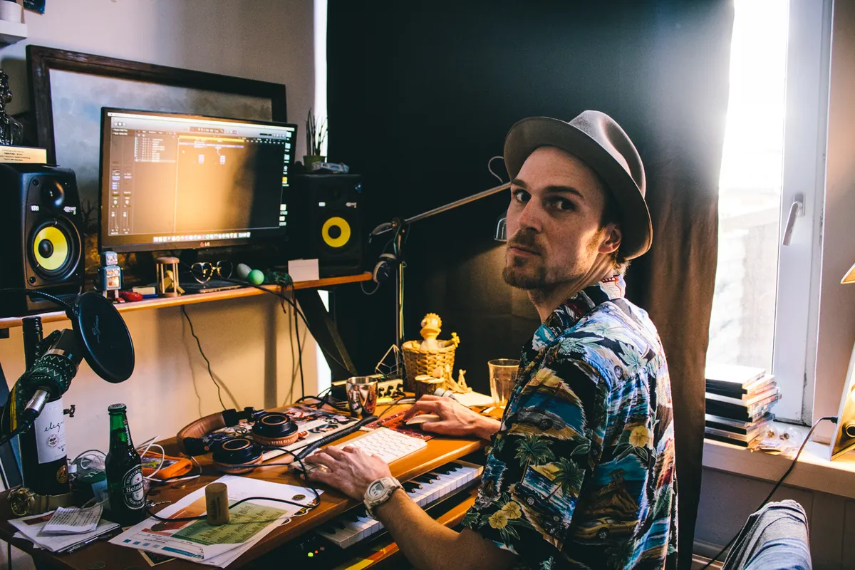 Inderdaad blijkt Tienus - vlassig ringbaardje, komisch hoedje en tropisch bloesje - in zijn kamer te zitten pingelen op een keyboard in een mini-studiohoekje. ‘Hee dude, leuk dat je er bent!’ Nee, dit is bepaald geen villa, maar eerder een lekker rommelige studentenkamer van hoogstens twintig vierkante meter. Er hangt kerstverlichting, overal staan geinige curiosa en op de tv loopt via Netflix continu een natuurdocumentaireserie door. Tienus stelt zich al direct op als een heerlijke droogkloot, maar hoe hij zijn vingerafdrukken achterliet op de grote hit van Kygo? Laten we maar gewoon beginnen bij het begin: hoe hij in de wondere wereld van schrijvers is terechtgekomen, en hoe mogen we die wereld noemen? Een schaterlach: ’We noemen deze wereld gewoon planeet aarde, ik ben hier geboren dankzij mijn moeder en mijn vader. Nee, dat is flauw, hè?’