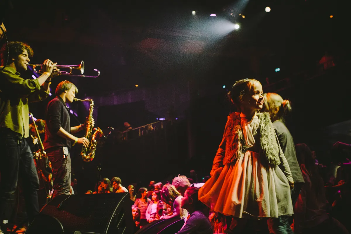 Een jochie van hoogstens acht met een gek zebrapetje staat ongegeneerd te dansen, zijn armen euforisch in de lucht bij elke toeter die hij hoort. Drie kleutermeisjes verderop over de rand van het podium hangen, gefascineerd turend naar die exotische blaasinstrumenten en trommels van Jungle By Night. Buiten de zaal ligt een grasmatje om op te spelen, even verderop een stand waar je je eigen mop kunt tappen, overal zijn knutselhoekjes, en er zijn nog eens drie zalen met muziek, van lichte jazz tot klassiek tot pop. In totaal lopen er deze eerste Pinksterdag een dikke drieduizend mensen door het Utrechtse poppodium TivoliVredenburg tijdens de vierde editie van My First Festival, een festival op maat gesneden voor kinderen tussen pakweg twee en acht jaar. Er zijn kleintjes van amper een jaar jong, een hele grote groep van vier a vijf en nog wat kids van zeven tot negen.