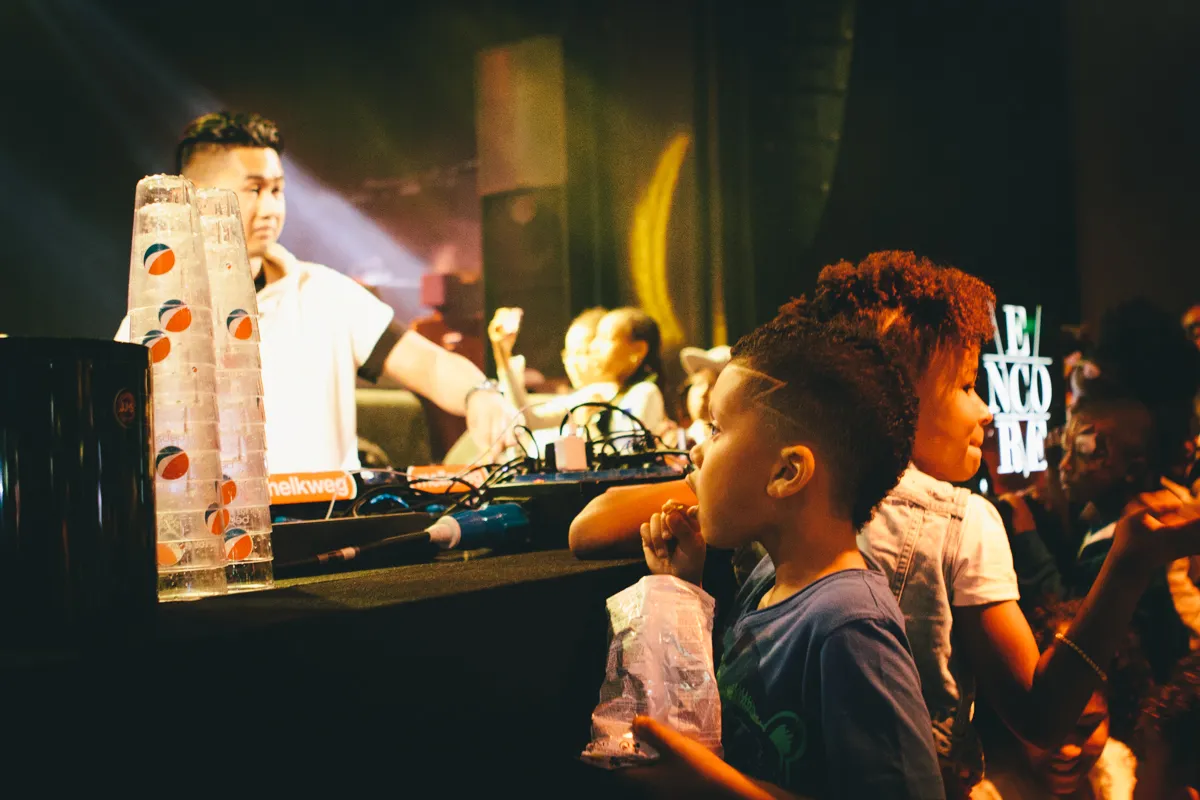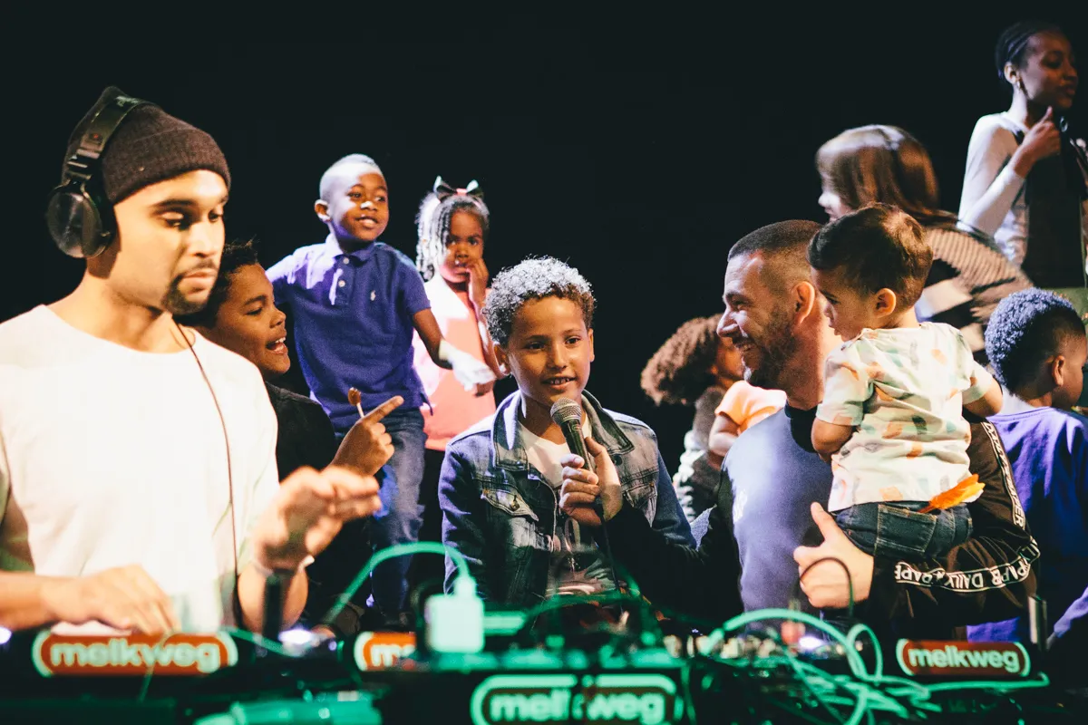 Een dag later in de Melkweg schatert ook Riques ter Heerd alias DJ Prime wanneer het mierzoete melkdrankje ter sprake komt. ‘Wij hadden de vorige keer ook te weinig Fristi en chips ingeslagen!’ Hij organiseert Encore Junior, dat deze Pinkstermaandag zijn tweede editie beleeft. Het is een hiphop/R&B-clubnacht zoals Encore al jarenlang succesvol host in de Melkweg, maar dan overdag en voor de allerkleinsten. In twee zalen draaien de Encore-dj’s en speelt een enkele liveact, in het theaterzaaltje boven zijn percussie- en choreografie-workshops en in de gangen kun je je eigen Snapchat-videoclip maken.