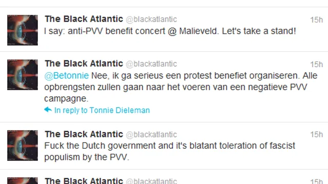 The Black Atlantic kreeg al veel reacties op de tweets. “Zo had ik op Twitter een discussie met een raadslid van GroenLinks in Huizen (Larisa Landré, red.). Zij vond dat ik er een positieve spin aan moest geven.” Maar daar is Van der Velde het niet mee eens: “Je kunt iemand als Geert Wilders een tijd negeren, maar op een gegeven moment moet je in actie komen.”