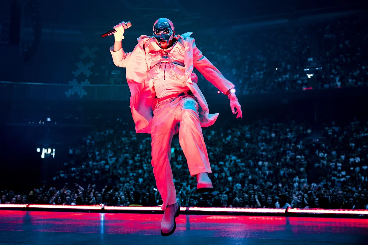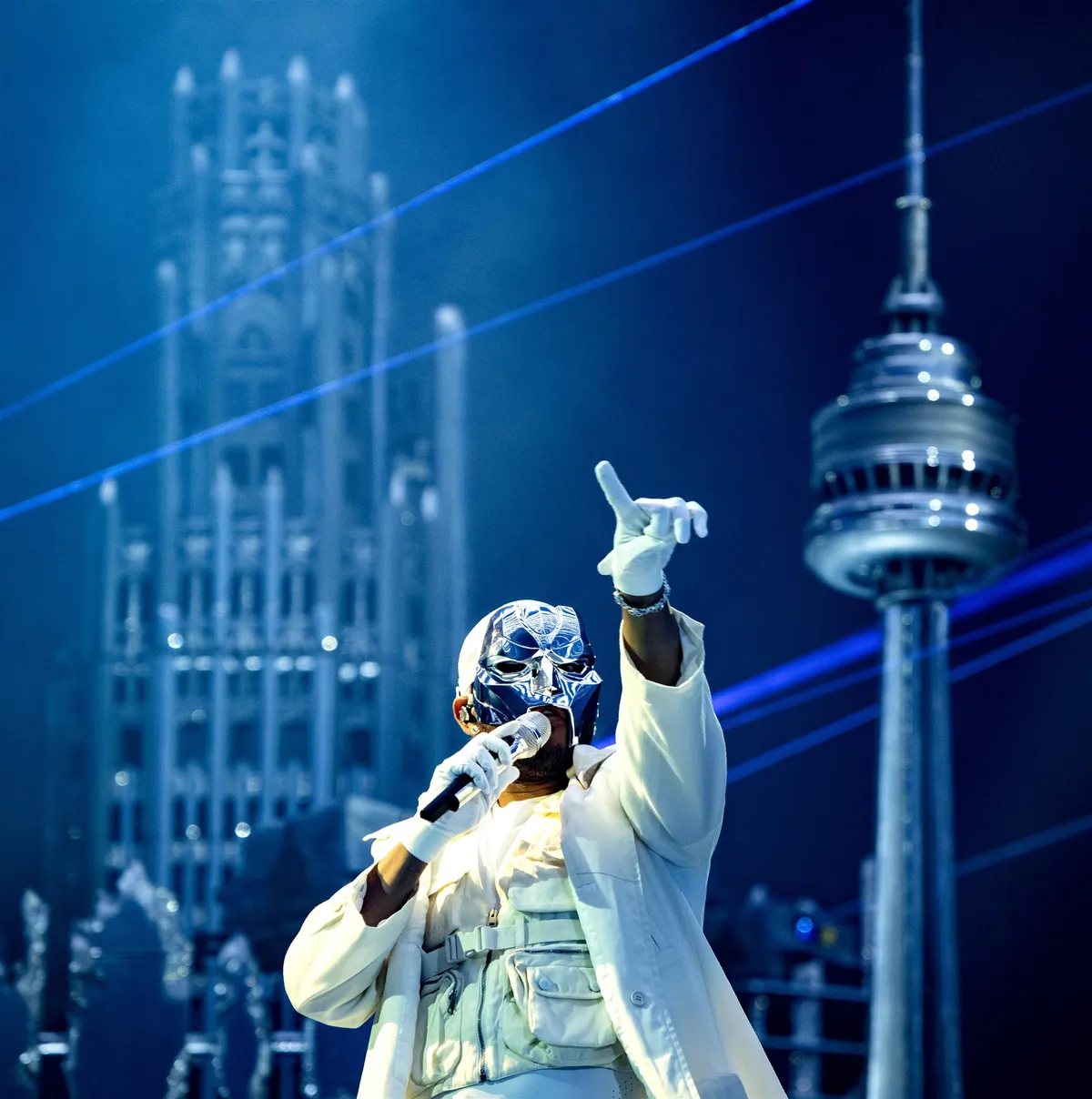 Wat een weergaloos zicht: Abel Tesfaye alias The Weeknd loopt in slowmotion over een catwalk zo lang als het stadion zelf en heft zijn handen in de lucht terwijl gigaaaaantische vlammentongen vanuit de vloer naar boven schieten om het dak te likken. Hij draagt een zilveren masker (a la MF Doom, of liever nog: zoals superschurk Doctor Doom) en stuurt een peloton aan wit gesluierde danseressen aan. De enorme maan die aan het plafond hangt is inmiddels felrood gekleurd, en het intro van Kanye West-gospeltune 'Hurricane' (een orkest van overbelaste gitaarversterkers) versmelt in The Weeknd-giga-hit ‘The Hills’. Op het podium is een dystopische stad in puin te zien, met ruïnes van o.a. St Paul’s Cathedral (Londen), CN Tower (Toronto) en de Empire State Building (New York), en die gebouwen staan inmiddels ook al in lichtelaaie. ‘I just fucked two bitches 'fore I saw you’, zingt The Weeknd in zijn zijdezachte kopstem. En ook: ‘When I'm fucked up, that's the real me, babe.’