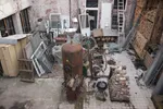 Verderop, vanaf het dak van de fabriek, kun je de eindeloze Stalin-bouw flats zien, grauwe blokken met kleine raampjes. Het lijken wel gevangenissen, maar de echte gevangenis stond iets verderop. "Soms komt hier iemand het terrein op die dertig jaar in de fabriek gewerkt heeft, die me erover vertelt. Ik had ook een keer een taxichauffeur die allerlei verhalen had. Boven in de fabriek was een kantoortje van de Stasi, vanwaar de mensen op de werkvloer gemonitord werden. Je kon als arbeider maar beter niet te veel mopperen, want dan kon je zomaar verdwijnen naar de gigantische Stasi-gevangenis die hier een paar blokken vandaan stond. Een verschrikkelijke plek, waar ze je tot de enkels in het water lieten staan, zodat je niet kon gaan zitten of liggen. Ze reden soms met mensen in een busje tachtig keer om het gebouw om ze te desoriënteren. Je dacht dan echt dat je in Siberië was, terwijl je alleen maar aan de andere kant van het gebouw was. Ik vind het super fascinerend. Toen we hier net aankwamen vonden we in de fabriek allemaal Lenin-vlaggen en boekjes over de industrie. Aan de binnenkant van de lockers zaten foto's van typische DDR-vrouwen."