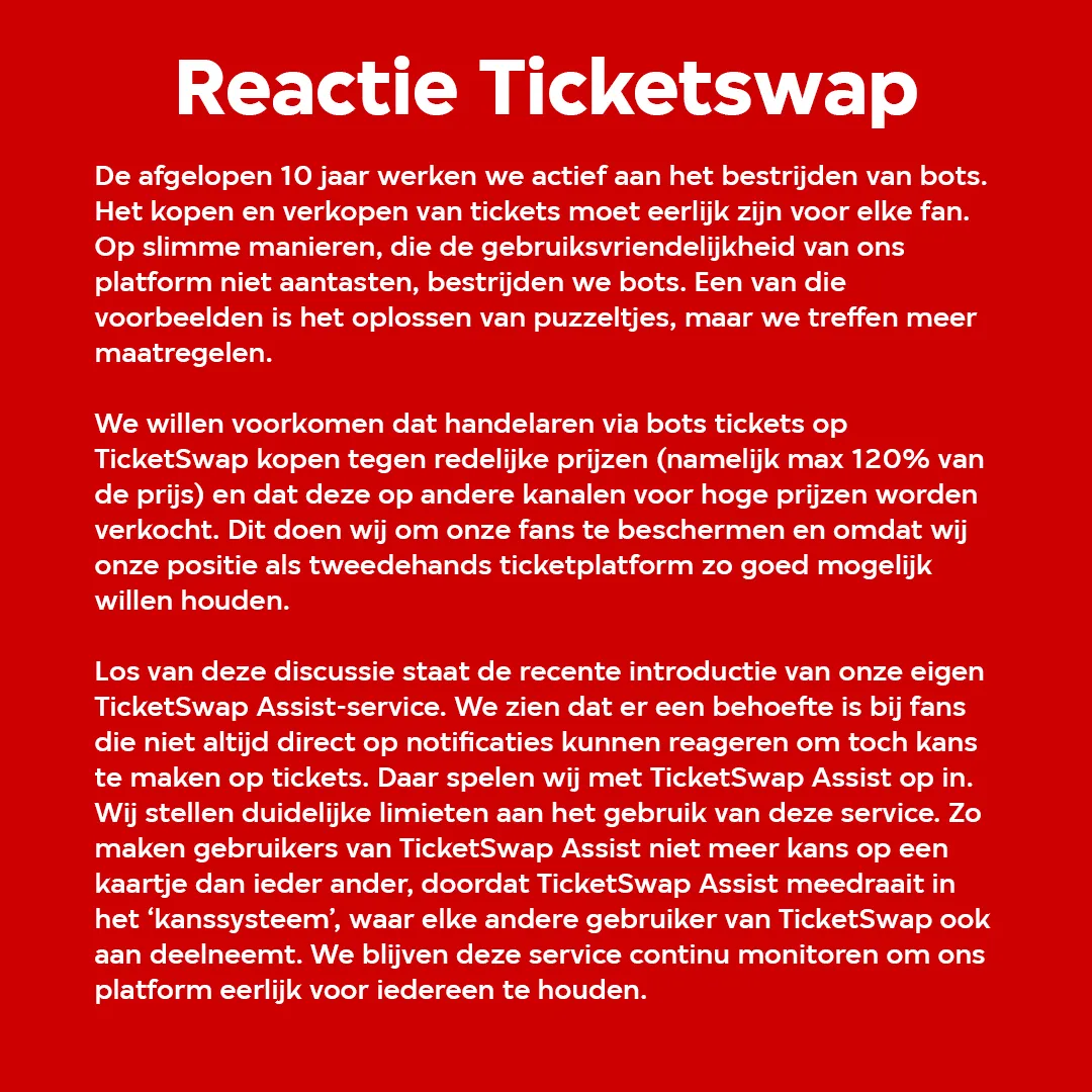 ‘TicketSwap onderneemt nauwelijks actie tegen bots’, zegt een anonieme botbouwer tegen techjournalist Daniël Verlaan van RTL Nieuws. ‘Ze pretenderen dat ze veel doen, maar de meest basale beveiligingsmethoden worden niet gebruikt. En omdat ze niet van ons kunnen winnen, komen ze nu zelf met een eigen bot waarmee je meer kans maakt op een kaart en waarvoor je extra moet betalen. Ze knijpen concertgangers gewoon uit.' 'De afgelopen tien jaar werken we actief aan het bestrijden van bots', reageert TicketSwap.