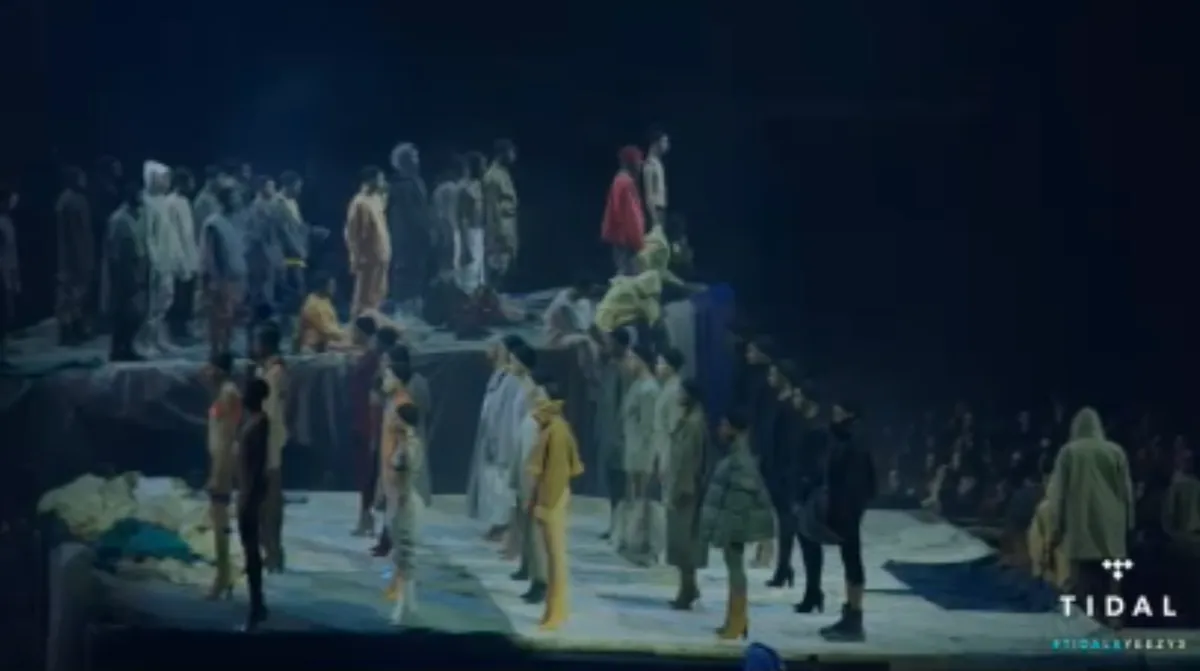 Het ging gisteravond natuurlijk niet alleen om het nieuwe album, maar ook om de nieuwe collectie die Kanye West ontworpen had. Honderden modellen stonden roerloos in de immense zaal. Ze hadden van te voren uitvoerige instructies gekregen van performancekunstenares en regisseur van de avond Vanessa Beecroft. Zo mochten de modellen wel gaan zitten als ze moe werden, maar nooit tegelijk. Er mocht niet snel bewogen worden, maar ook niet langzaam. Geen oogcontact gemaakt worden, niet gedanst, niet sexy geposeerd, maar ze moesten wel zelfverzekerd zijn. Lees vooral de hele instructie. Een model leek zelfs in slaap te vallen. Wacht, was dat niet Young Thug? Alleen daar al gingen populaire cultuur en haute cultuur samen, net als wat Kanye in zijn collectie leek te proberen. En over mode gesproken: de ontwerper van de hoes van het album, de belg Peter de Potter is vooral bekend zijn samenwerkingen met de Belgische topontwerper Raf Simons.