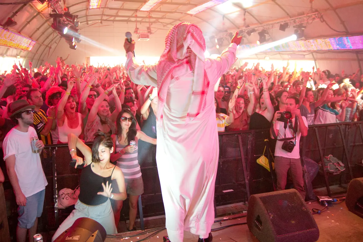 Een kwartier voor aanvang van zijn show komen drie blanke studententypes met geblokte theedoeken de tent binnen. Moet de Syrische cultfiguur dat nu als een compliment beschouwen, of niet? Het is bloedheet dat jaar op Lowlands, en de bruiloftszanger voert de temperatuur in no time op tot woestijnniveau. Zijn muziek is onnavolgbaar, een mix tussen traditionele Arabische muziek en reggaeton-achtige ritmes en harde beats, in een stijl die dabke genoemd wordt. Zijn Koerdische en Arabische teksten zijn natuurlijk voor de gemiddelde Nederlander niet te verstaan, maar dat zal vandaag niemand wat uitmaken. Omar Souleyman is dat jaar de held van Lowlands. (ook dat jaar: Pearson Sound b2b Ben UFO, Azari & III, Jackmaster)
