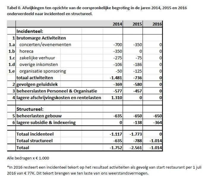 Het college wil de begrotingstekorten van dit en volgend jaar dichten met eenmalige bijdragen en vraagt daarvoor geld aan de gemeenteraad. Het voorziene structurele tekort van 1 miljoen (zo schat TivoliVredenburg vanaf 2016 in) is zorgwekkender. Dat zijn kosten voor het gebouw (onderhoud en energie) en door 'teruglopende subsidies'. Een belangrijke oorzaak van het probleem ligt volgens het schrijven in achterblijvende sponsorwerving. Die was duidelijk veel te rooskleurig voorgesteld: "Van de benodigde € 9 miljoen, zoals geformuleerd in het investeringsbesluit, is tot nu toe € 3,9 miljoen binnen gehaald." Er zijn ook meevallers, volgens de rapportage is TivoliVredenburg "positief uit de startblokken gekomen: In 2014 worden hogere inkomsten verwacht ter waarde van € 600.000, oplopend tot rond € 1 miljoen in 2016." Ook zouden dit jaar 190.000 (27%) meer bezoekers ontvangen zijn dan was geraamd.