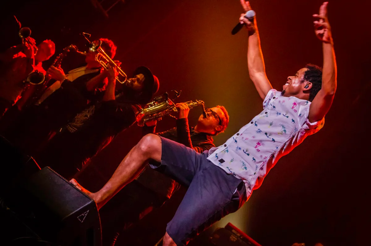 Even later valt het doek, waarna Typhoon en zijn Titanenband ingetogen openen met We Zijn Er. Zichtbaar tevreden overziet de rapper de zaal. “Met hiphop twee keer de HMH uitverkocht”, zegt hij. Even later bedankt broer en sidekick O-Dog in het speciaal alle mensen “die eigenlijk niet echt van hiphop houden, maar denken: die Typhoon heeft wel gelijk”. De spijker op zijn kop natuurlijk, want sinds die langverwachte plaat Lobi da Basi vorig jaar uitkwam heeft de Zwolse rapper (opgegroeid op de Veluwe) vele harten buiten de hiphopscene gewonnen. Hij stond op alle grote Nederlandse festivals, was te gast bij 24 Uur Met, won de 3voor12 Award, mocht het kritische Van De Regen Naar De Zon over het Nederlandse slavernijverleden in de Ridderzaal spelen voor het koninklijk paar en de premier. Hij werd gevraagd het themalied voor Serious Request te maken - Niet Weglopen is net uit (vanavond overigens niet gespeeld) - om maar wat te noemen.