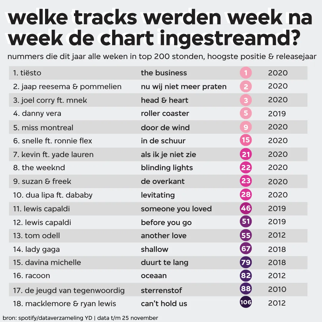 Week na week de top 200 halen: achttien verschillende nummers deden het dit jaar. Het gros van die tracks is in 2020 uitgekomen - waarvan Tiësto’s EDM-pomper ‘The Business’ als enige op één eindigde - met een aantal oudere nummers waar Nederland maar geen genoeg van lijkt te krijgen. De meest opvallende liedjes die alle 46 de onderzochte weken in de hitlijst stonden zijn ‘Can’t Hold Us’ van Macklemore uit 2012 (!) en De Jeugd van Tegenwoordig’s ‘Sterrenstof’ uit 2010 (!!).