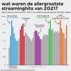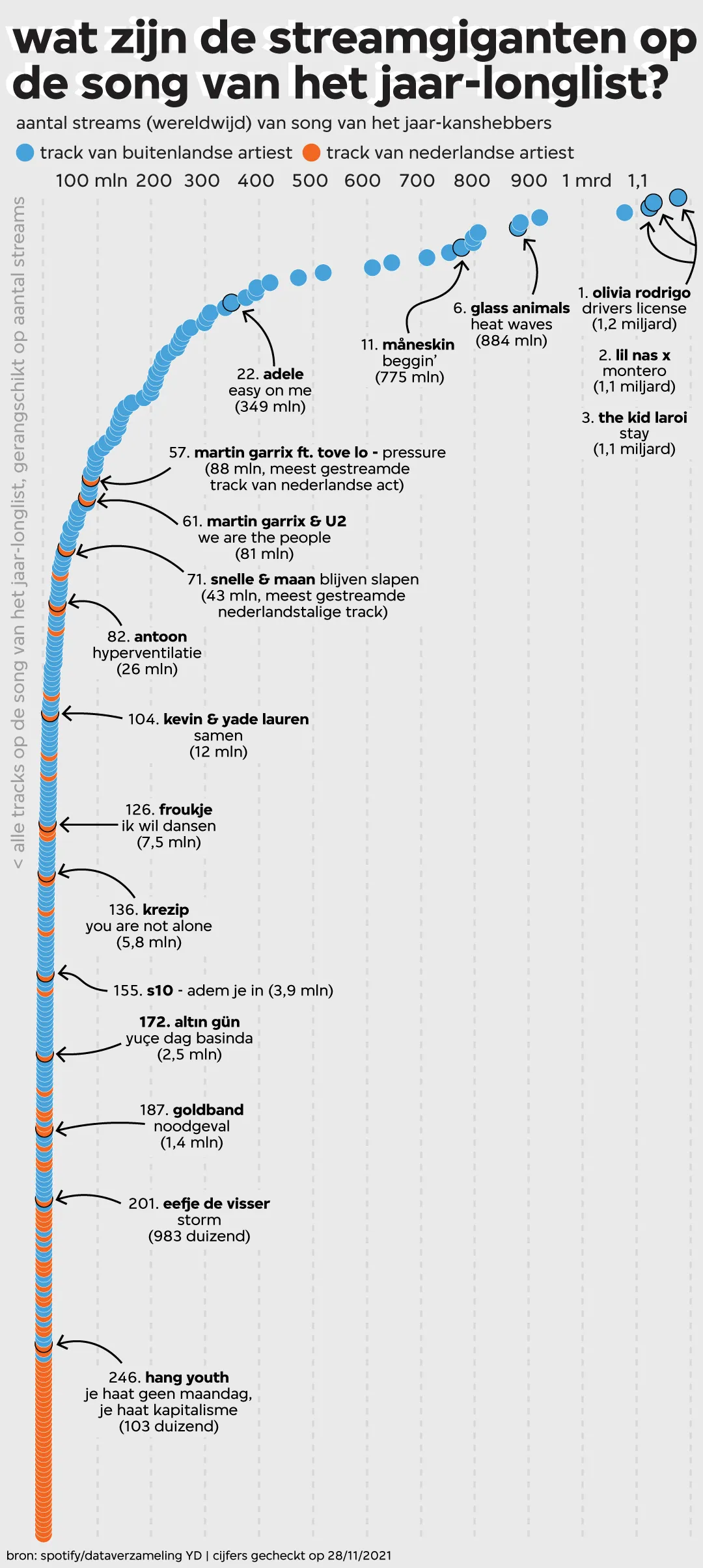Aanstaande vrijdag 3 december wordt bekendgemaakt welke track zich ‘Song van het Jaar 2021’ mag noemen. Op de longlist voor de titel staan ruim an 270 nummers uit binnen- en buitenland. Van mondiale gigahits als ‘drivers license’ van Olivia Rodrigo en ‘Montero’ van Lil Nas X tot Nederlandse nieuwkomers als ‘Ik wil dansen’ van Froukje en ‘Adem je in’ van S10: in de grafiek hieronder zie je alle kanshebbers gerangschikt op aantal streams.