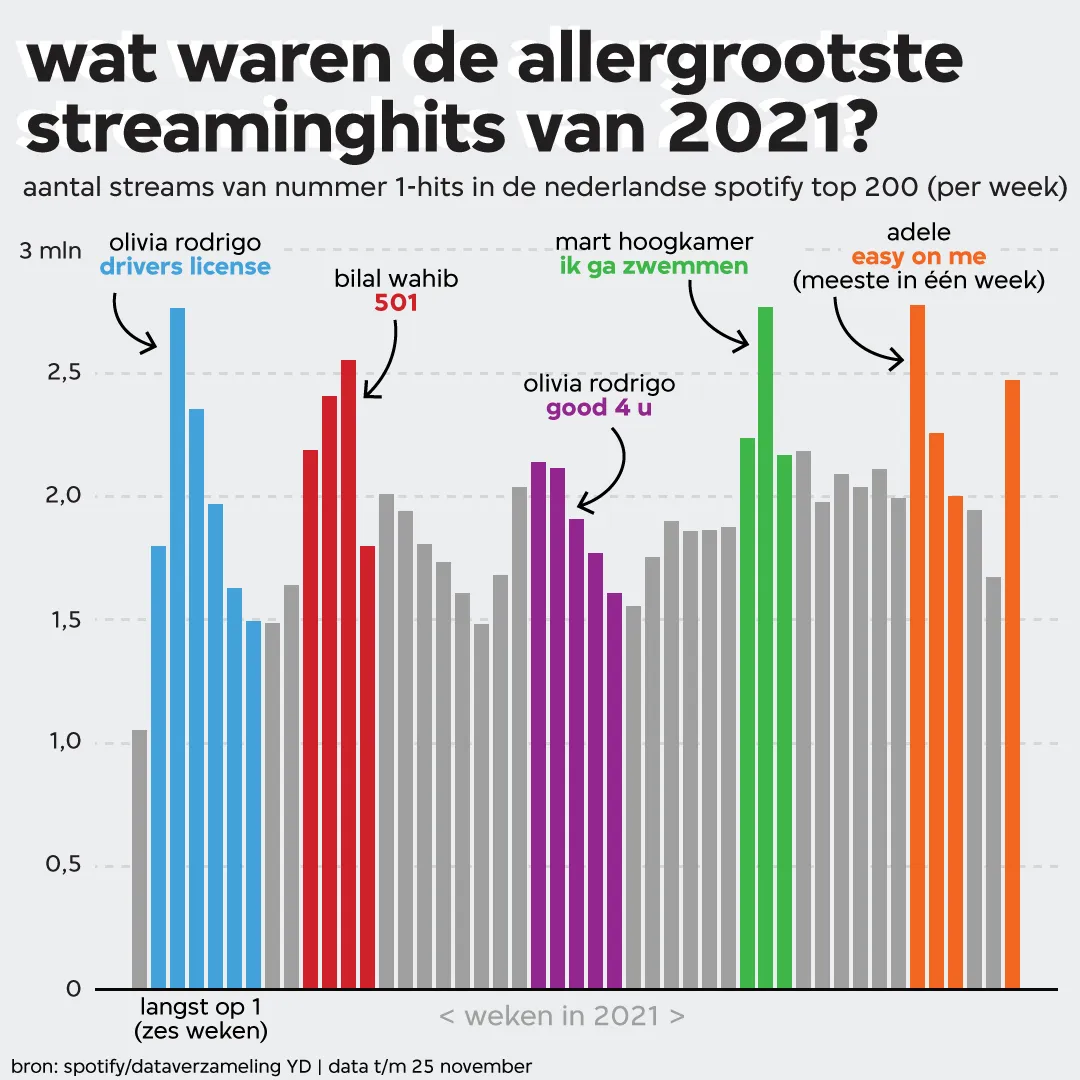 Met een schaamteloos stukje scoreboardjournalistiek blikken we terug op een turbulent 2021. Het was een jaar waarin newbie Olivio Rodrigo als dé hitgigant uit de bus komt en Adele met haar comebacksingle het weekluisterrecord pakt. Een jaar waarin Kevin de Nederlandse rapgame uitspeelt en Yade Lauren de must-have gastzangeres wordt. Drake die hit wise weliswaar wint van Kanye, maar qua streams Mart ‘Ik wil zwemmen in Bacardi Lemon’ Hoogkamer achter zich moet laten. Een analyse van 46 weken aan Nederlandse singlehitlijsten.