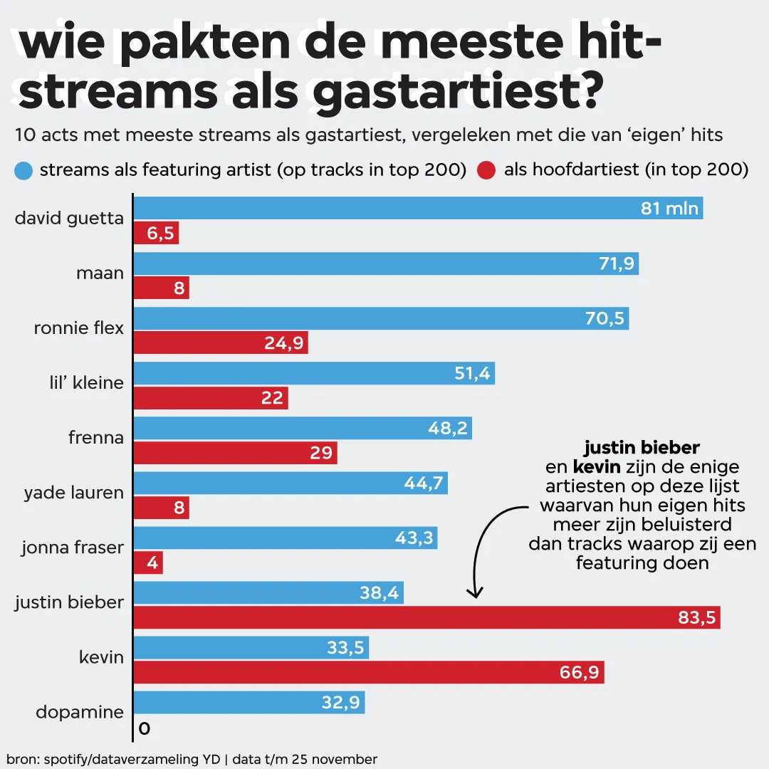 Van de tien acts die de meeste streams op hits als featuring artist vergaarden, zijn er slechts twee waarvan hun eigen nummers vaker werden beluisterd. De eerste is Justin Bieber, die naast z’n hits als gast bij Ariana Grande, Shawn Mendes en The Kid LAROI enorm scoorde met zijn album ‘Justice’. De tweede act is de Rotterdamse rapper Kevin, waarvan zijn hittracks ‘Samen’ (met Yade Lauren), ‘Praat met mij’ (met Yade Lauren) of ‘Als ik je niet zie (met, ja echt, Yade Lauren) miljoenen keren werd aangeslingerd. Deze nummers zijn in totaal goed voor 67 miljoen streams. Zijn bijdragen bij onder andere Josylvio, Lijpe en S10 werden meer dan 33 miljoen keer beluisterd.