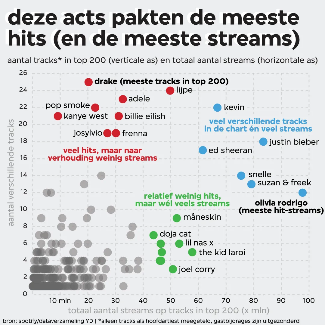 Toch kunnen veel acts ook zonder nummer 1-hit terugkijken op een meer dan geslaagd streamingjaar. Om er achter te komen welke artiesten dit jaar het best gescoord hebben in de charts kijken we naar twee dingen: het aantal verschillende liedjes in de top 200 (dit getal bepaalt de plek op de verticale as in onderstaande grafiek) en het totaal aantals streams van die nummers op het moment dat ze in de hitlijst stonden (de plek op de horizontale as). Hierbij kijken we alleen naar de hoofdartiest van een track. Gastbijdrages zijn dus niet meegeteld.