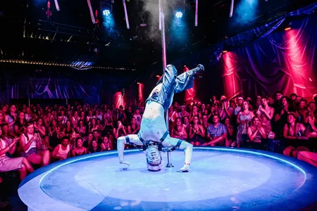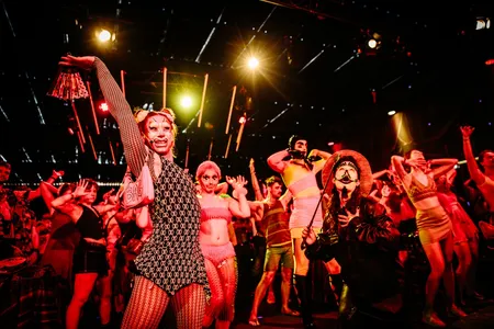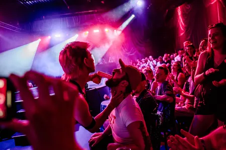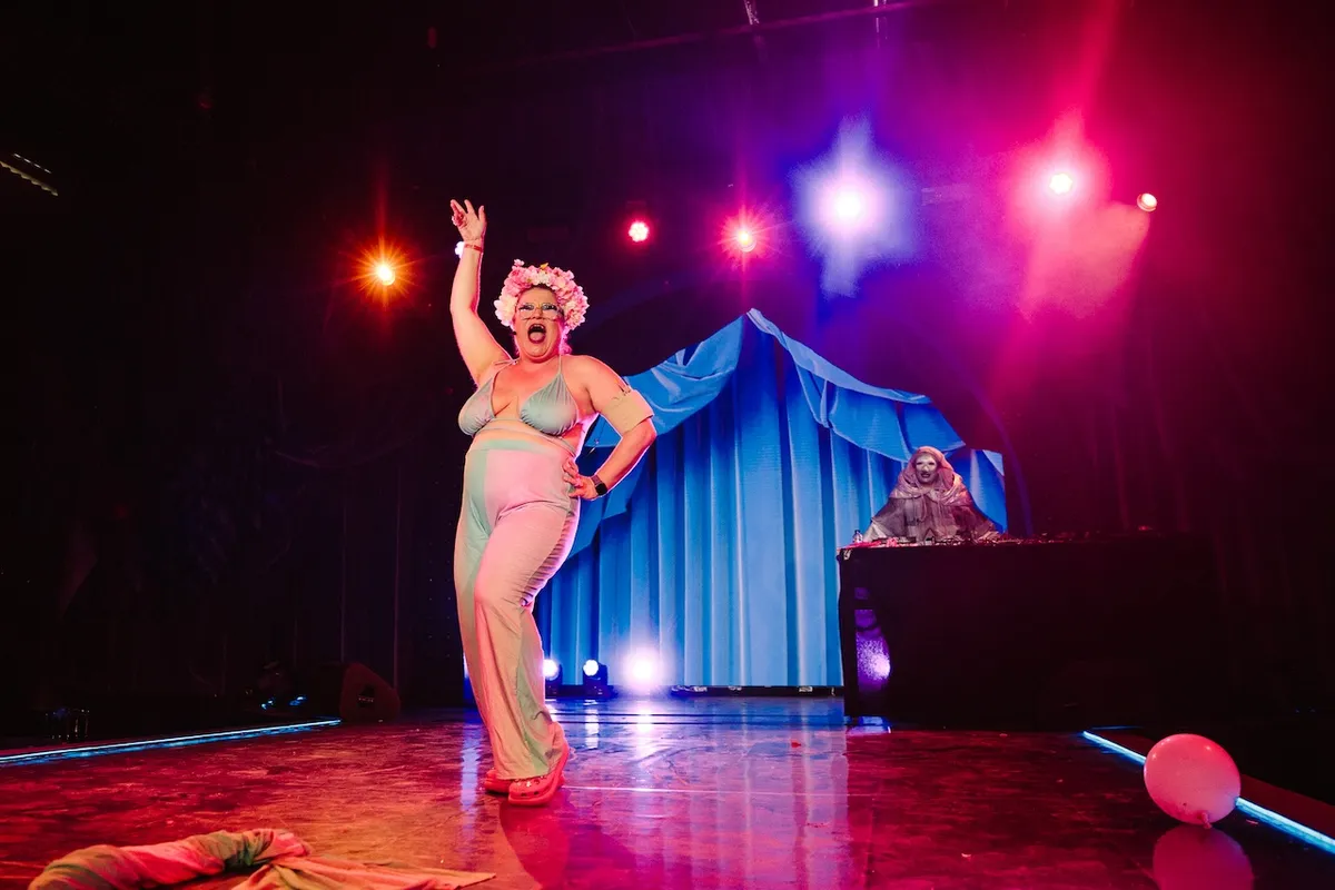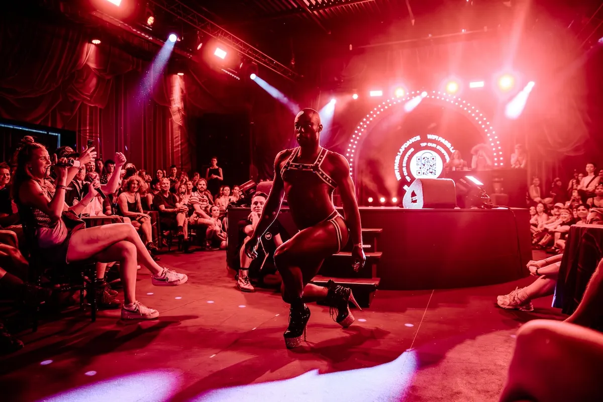 Het is er meteen volle bak, en we worden aan het werk gezet: sensuele aerobics, er wordt onderwezen in burlesque moves. Het mag best melig worden, maar met een serieuze boodschap: zullen we in deze steeds engere wereld alsjeblieft ruimte houden voor queers, transmensen, dragqueens, paradijsvogels? Voor mensen die het leven kleur geven?