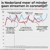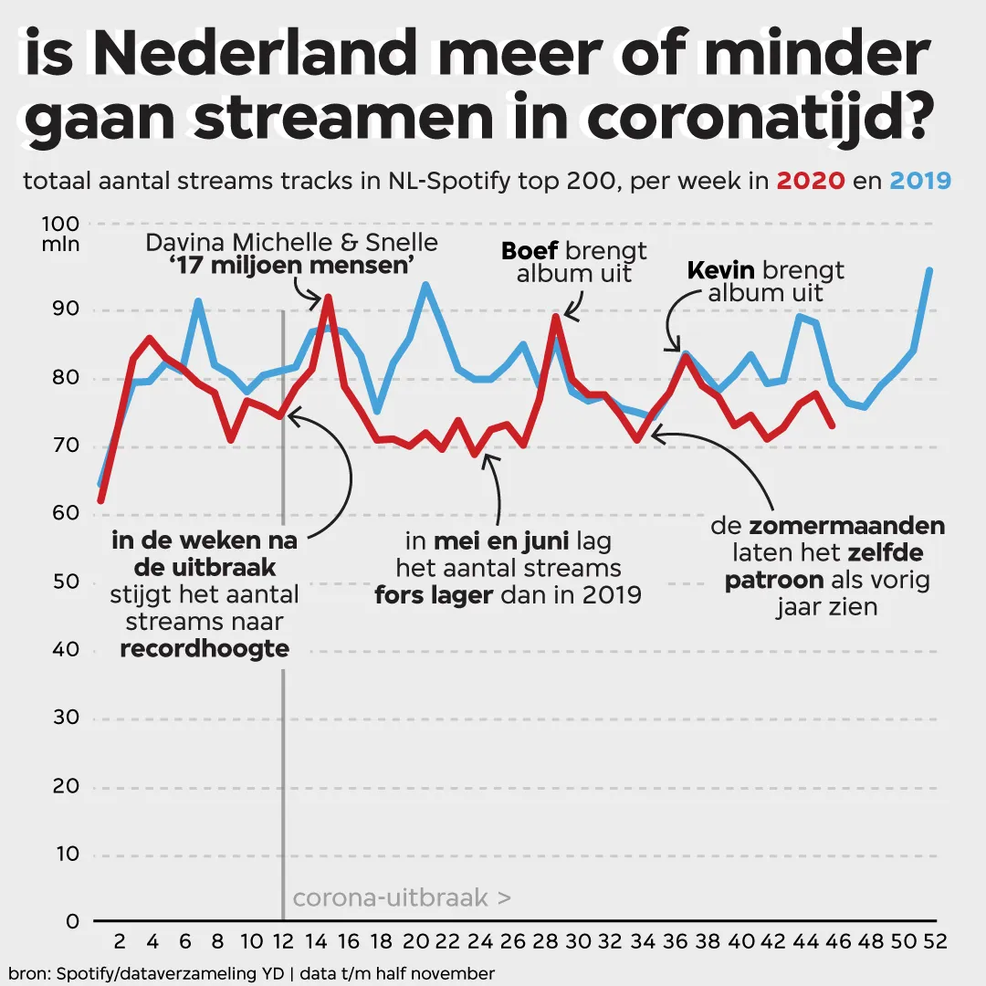 Laten we deze analyse van streamingcijfers beginnen met een voor de hand liggende vraag: is Nederland anders gaan streamen door corona? Dat lijkt dus wel mee te vallen. We kijken naar de hitlijst van tweehonderd meest gestreamde tracks in Nederland die Spotify wekelijks publiceert. Een track moet in een week tijd gemiddeld zo’n 160 duizend keer beluisterd worden om in die lijst te komen. Tot en met de week van 9 april, middenin de schouders-er-onder-we-kunnen-de-intelligente-lockdown-samen-aan-periode, stijgt het totaal aantal streams van die tweehonderd liedjes week na week. Dat komt onder andere door ‘17 miljoen mensen’ van Davina Michelle en Snelle. De feelgoodremake van het origineel van Fluitsma & Van Tijn stuwt het totaalcijfer naar 94 miljoen. Dat is dit jaar het hoogste aantal in één week.