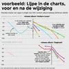 Dat heeft dus effect. Dit is het best te illustreren aan de hand van een daadwerkelijke release. In de graphic hieronder zie je de hitlijstposities van tracks van rapper Lijpe rondom de release van zijn album Andere Leven in 2018, en die van Dagboek dit jaar. Twee jaar terug stonden in de week van release alle 13 nummers in de single top 100. Zes daarvan bleven er nog (wat) langer in, de rest slechts één week. Dit jaar zie je dat slechts drie nummers – het nieuwe maximaal aantal van de GfK – de hitlijst halen maar wél op een hogere positie.