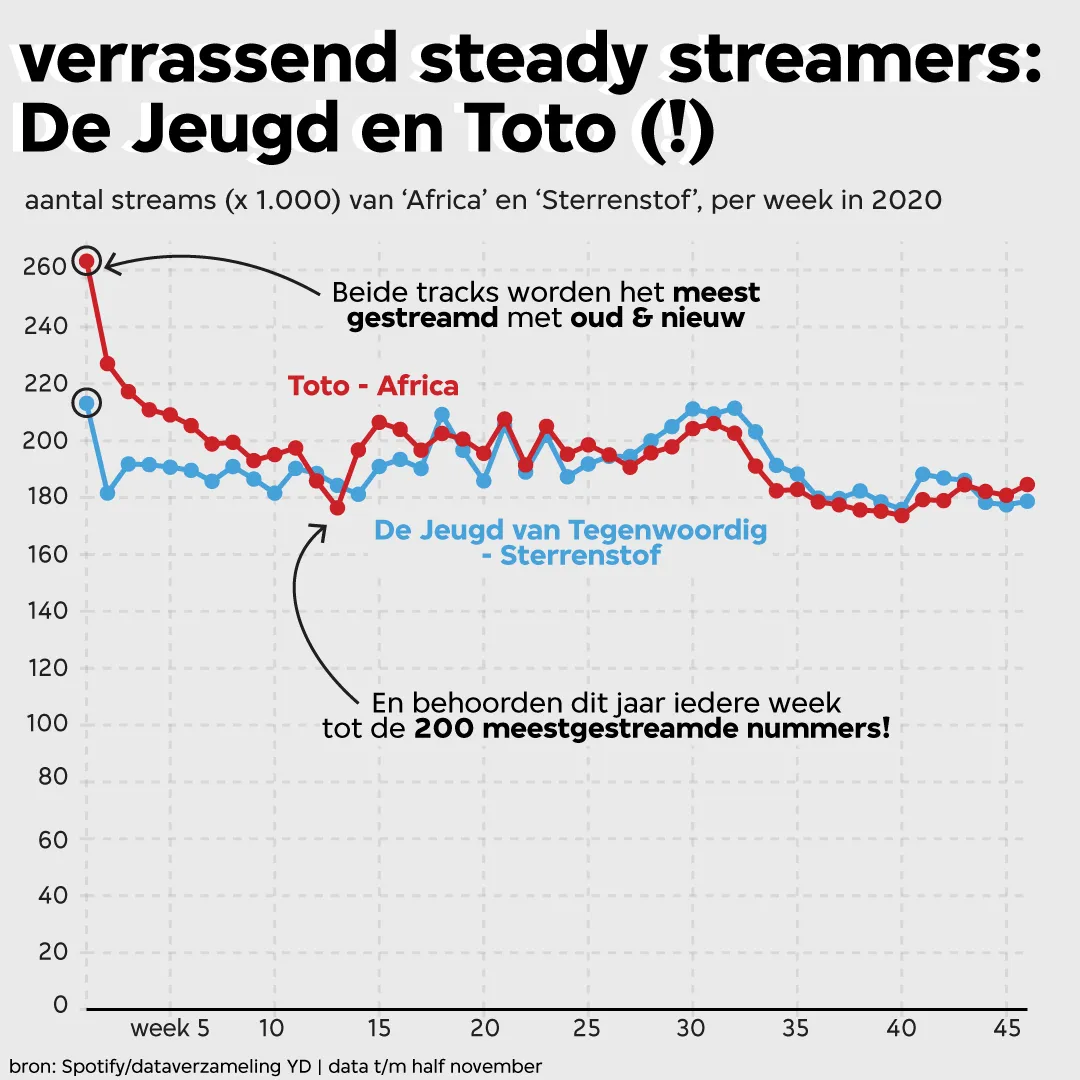 Dat zijn ‘Africa’ van Toto en ‘Sterrenstof’ van De Jeugd van Tegenwoordig. Beide tracks lijken echte oud en nieuwknallers te zijn. De hit van Toto is al 38 jaar oud, maar in de eerste week van januari alsnog goed voor 260 duizend streams. Daarmee haalde het nummer van de Amerikaanse rockgroep de 77e plaats in de hitlijst. ‘Sterrenstof’ vierde in november van dit jaar zijn tienjarig jubileum. Ook deze megahit lijkt het goed te doen op nieuwjaarshuisfeestjes (213 duizend streams in week 1) en piekt verder in de zomermaanden. Vooral opvallend is dat beide nummers min of meer hetzelfde patroon laten zien. Zijn het allebei mandatory meezingers tijdens dronken huisfeestjes? Is de ‘Toto-pa’ stiekem ook De Jeugd-fan? Deelt de gemiddelde De Jeugd-fan een Spotify-account met ouders? Staan ze bovenaan in een of andere playlist (en zo ja, met welk thema)? Zijn het fijne positivotracks in meh-coronatijden? Of zegt dit gewoon heel veel over de muzieksmaak van de gemiddelde Nederlander?