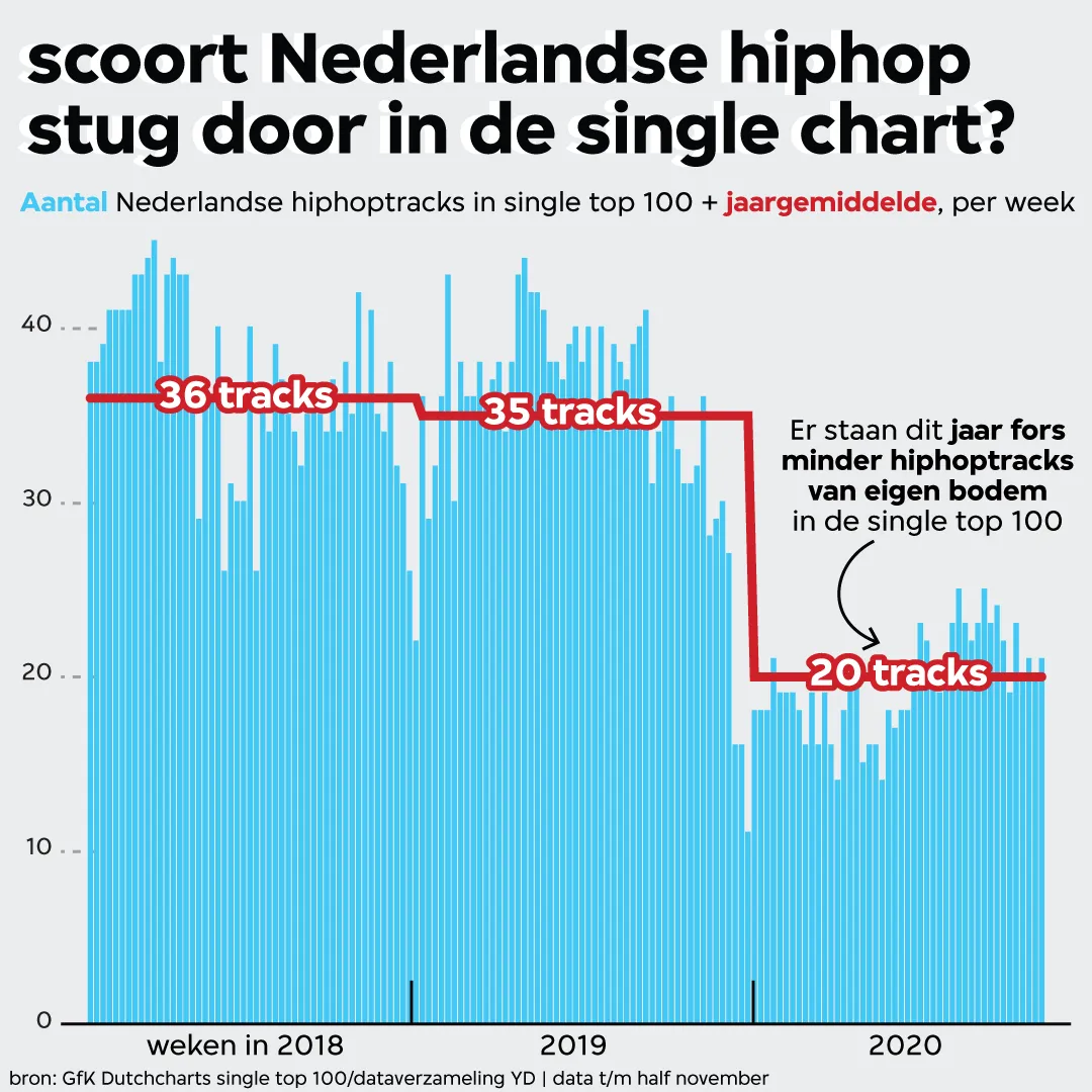 Voor dit verhaal is gebruik gemaakt van data van twee verschillende bronnen. Allereerst is wekelijks de Nederlandse Spotify single top 200 verzameld. Hierin is de hoofdartiest, de titel van het liedje en het aantal streams opgenomen. In de graphic over het aantal hitlijst-tracks per artiest zijn featuring artists dus niet meegeteld. Daarnaast is per week de GfK Dutchcharts single top 100 gebruikt. Hierbij wordt enkel de positie in de hitlijst, artiest en titel bijgehouden. In die top 100 zijn wekelijks handmatig de Nederlandse hiphoptracks gecategoriseerd. Alle gegevens lopen t/m half november (week 46).