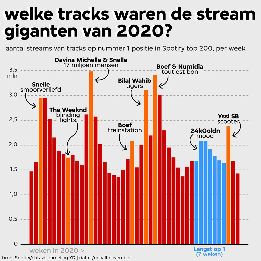 Laten we naar de grote hits gaan. Zeventien verschillende nummers stonden dit jaar op 1 in de Spotify top 200. Davina Michelle & Snelle brachten met ‘17 miljoen mensen’ de track uit die in een week tijd het meest werd beluisterd: bijna 3,5 miljoen keer. Boef volgt met ‘Tout Est Bon’ (3,4 miljoen), ‘Tigers’ van aspirant-superster Bilal Wahib haalt met 3,1 miljoen streams de derde plaats. Een andere opvallende nieuwkomer is Yssi SB. De jonge Amsterdamse rapper uit het kamp van Henkie T scoort eind oktober met ‘Scooter’ zijn eerste nummer 1-hit.