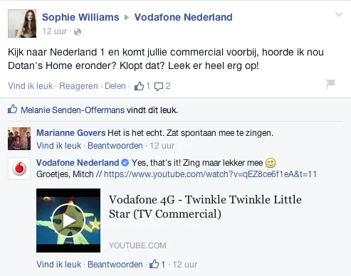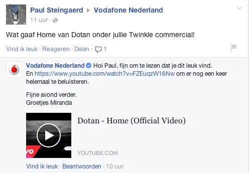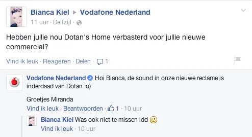 Opmerkelijk genoeg communiceert de klantenservice van Vodafone op Facebook in meerdere berichten dat ze wel degelijk Home van Dotan onder de reclame gebruiken. "Dat ze mijn muziek kopiëren vind ik al jammer, maar dat ze uitdragen dat ik dat ben? Dat vind ik het gekste. Ik ben verbaasd dat ze op die manier met mijn muziek aan de haal gaan."