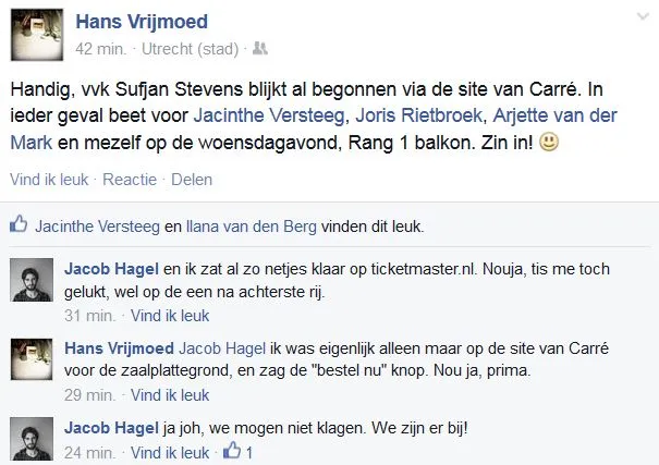 Een woordvoerster voor Carré is zich bewust van de teleurstelling onder fans: “Ik vind het ook heel sneu en vervelend voor die mensen. Bij ons gaan de meeste voorstellingen in de voorverkoop om 9 uur in plaats van 10, en deze is er tussendoor geglipt.” De voorverkoop wordt bij Carré van te voren ingepland en automatisch geactiveerd, maar dat is bij Sufjan dus niet helemaal goed gegaan. “Het is gewoon ontzettend stom, meer kan ik er ook niet van maken. Het was een menselijke fout.” Op kaartverkoopsite Ticketmaster ging een ander deel van de tickets wel om de geplande tijd in de verkoop, maar ook daar ging het razendsnel.