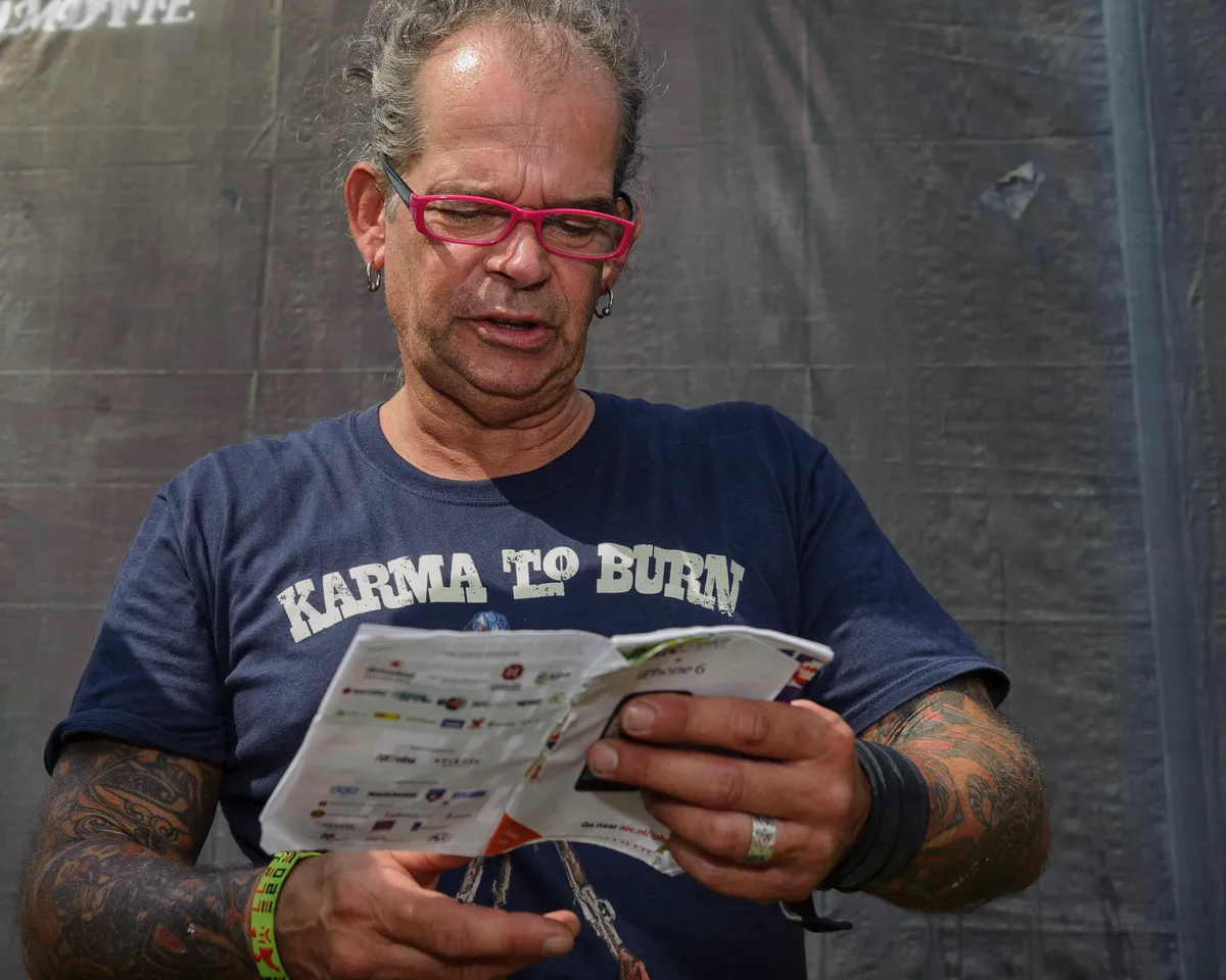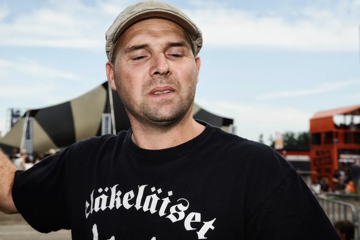 Jim uit Opmeer. Hij draagt een shirt van de Finse hoempapa-band Eläkeläiset. ‘Shit, mijn metalshirts liggen allemaal in de tent, moet ik ze even halen?’