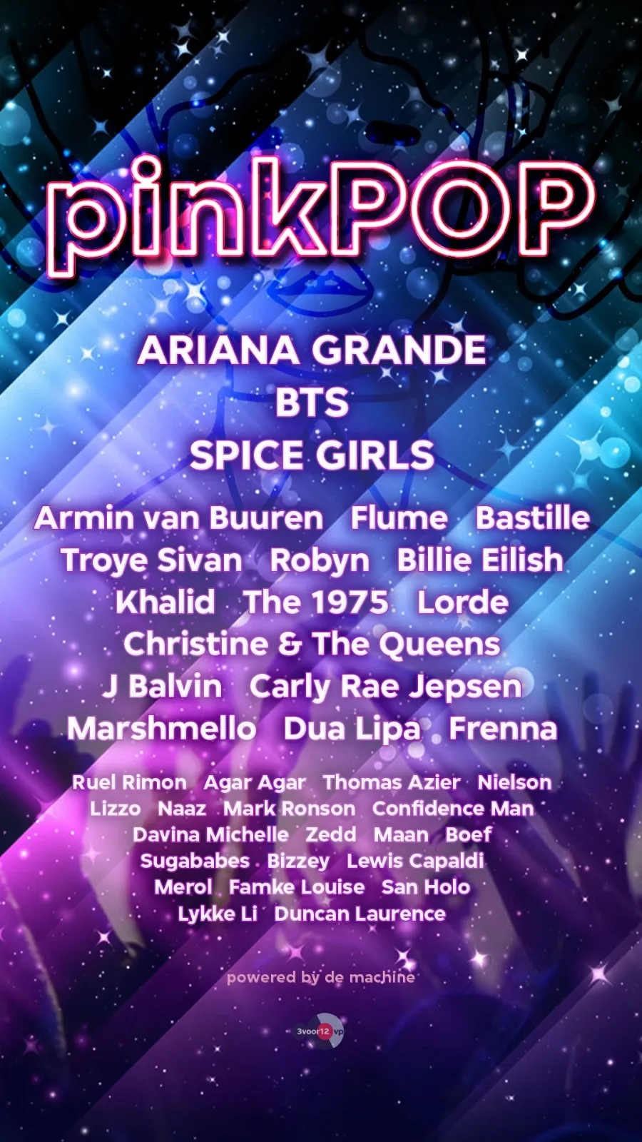 Wat nou als we het ons in ons hoofd eens voorstellen. Wat als Pinkpop geen roots had in de alternatieve rockcultuur? Stel je eens een festival voor waar Bruno Mars en Justin Bieber geen vreemde eenden in de bijt zijn, maar de norm. Hou je vast, want we maakten daadwerkelijk een programma. Gewoon, omdat het kan. Een line-up met alleen maar popacts, van de headliners tot het onbekende talent. Buitenlandse grootheden van nu, een paar terugkerende legacy acts, uiteraard een Nederlandse afvaardiging. De een super commercieel, de ander een popdarling van de critici, maar allemaal pop. De poster van onze droom line-up is een fonkelend meesterwerk, al zeggen we het zelf.