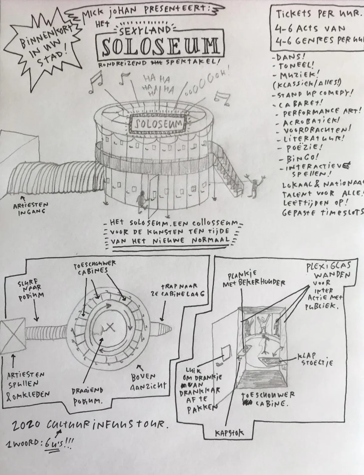 Met Mick Johan bedacht Sexyland ook het ‘soloseum’, een rondreizend spektakelstuk in de vorm van een amfitheater. ‘Denk aan een peepshow met een ronddraaiend podium, je kan in je eentje in een rukhokje gaan staan, en hebt zicht op het podium én het publiek aan de overkant. Dat willen we gaan bouwen. Je zou er optredens in kunnen doen, maar je zou er bijvoorbeeld ook kunnen eten. Er passen 68 mensen in.’