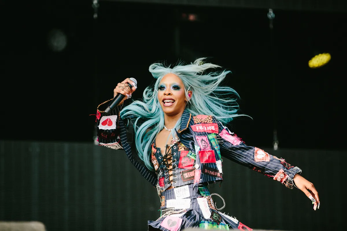 Maar de badste baddies? Die staan bij Rico Nasty. Ze ziet eruit alsof ze net van AfroPunk Festival komt, met turquoise haar, regenboogkleurige nagels en een denim pakje vol logo’s en schakelkettingen. Op de voorste rij staan de coolste chicks met pastelkleurig haar en punky fits. ‘Black punk! Black lipstick all over my fat blunt!’, gromt Rico, terwijl ze grijnzend over het podium huppelt. Ze is suikerzoet en gevaarlijk tegelijkertijd, een soort cupcake met studs, en haar sound is precies dat. Het ene moment rapt ze over hyperpopproducties van 100 gecs en hoor je Charli XCX’ stem in die ‘ringtone’-remix, het volgende staat ze bruut te schreeuwen over rauwe trapbeats vol loodzware bassen en nu-metalgitaren. Haar RAGE-anthem ‘Smack A Bitch’ uit 2018 is nog altijd haar grootste hit, en de chicks in de pit blèren hem keihard mee. ‘I DON’T NEED YOUR OPINION! Do what I fucking want!’