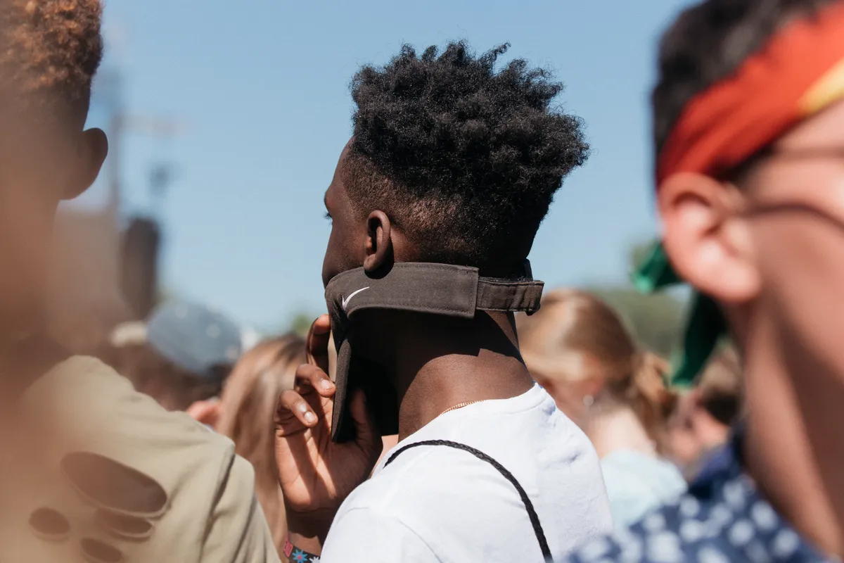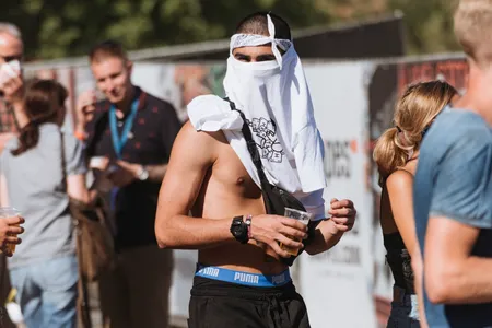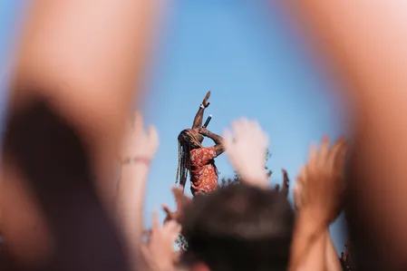 Het prachtige weer is voor WOO HAH! een vloek en een zegen. Een zegen omdat het met de twee open hoofdpodia niet echt regen-proof is. Een vloek omdat het door de lange droogte kurk- en kurkdroog is. Bij elk ander festival op dit zanderige terrein zou je dat merken, maar hier helemaal. Er is bijna geen show die niet in een of meerdere moshpits eindigt, waardoor er constant enorme bruine stofwolken boven het publiek stuiven. Na de show van Scarlrxd zie je bezwete koppen vol bruine vegen verdwaasd de pit uit lopen. Bij een jongen lijkt er zelfs een stroom modder uit zijn neus te lopen. Een bloedneus, vol aangekoekt zand. Het maakt dat de hele dag eruit ziet als de foto’s die je kent van de zuidelijke staten van Amerika in de jaren twintig. Grote droge vlaktes met dorre begroeiing, een schroeiende zon, mensen met gehavende gezichten en bruine shirts en schoenen die ooit wit waren.