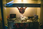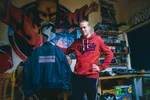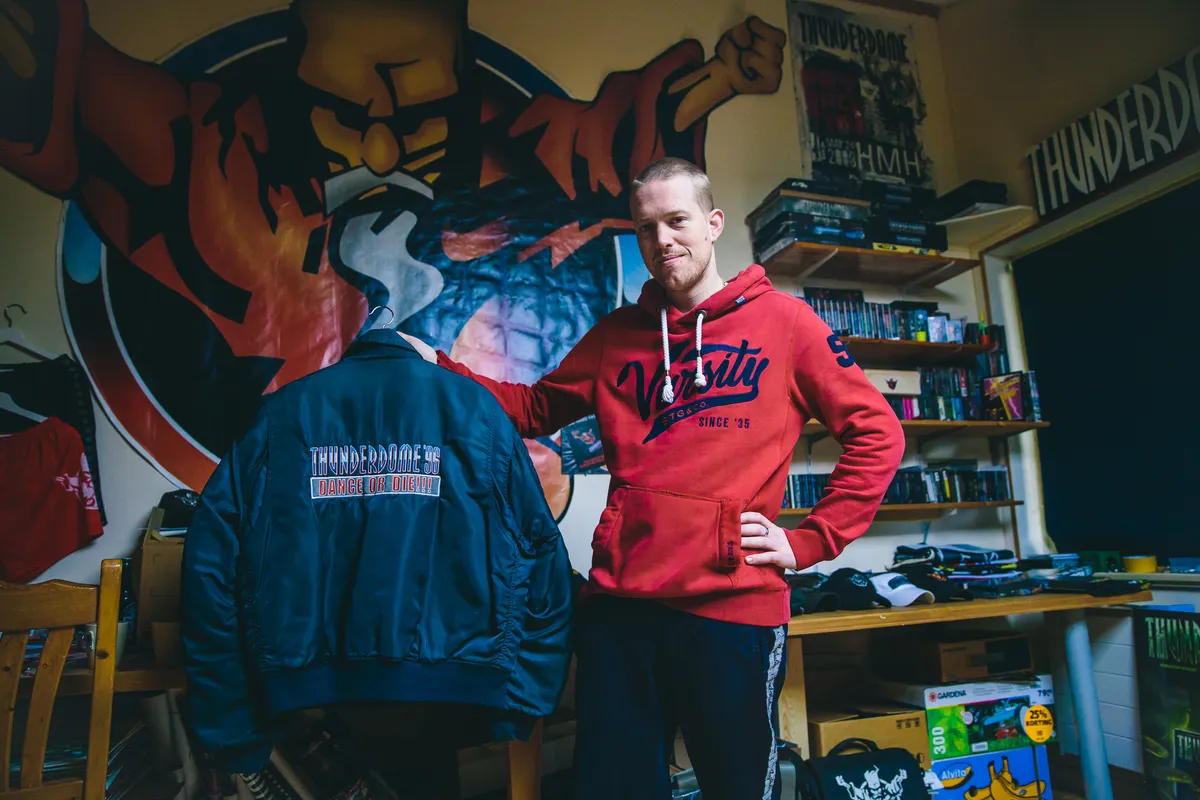 We lopen zijn Thunderdome-kamer maar eens binnen en dat is nogal een gezicht. Het is een flinke ruimte waarvan een hele muur volhangt met bomberjacks en kleding, een andere vol staat met cd’s en videobanden, en in een hoek staat een vitrine met curiosa als sleutelhangertjes, kettingen en een oude portemonnee. ‘Ik ben nu tien jaar aan het verzamelen, ik heb een stuk of dertig bomberjacks, een stuk of vijfentwintig vesten, in totaal zeker 200 items. Naar sommige stukken ben ik jarenlang op zoek geweest. Hier, deze bomberjack, bijvoorbeeld is een MA1-model van Thunderdome ’96, Dance or Die, zoals de meeste mensen kennen met een oranje binnenkant en zonder kraag. Ik heb hem op een zaterdag opgehaald in Groningen, daar zit je tweeënhalf uur voor in de auto.’ Hij pakt de volgende jack erbij en glimlacht. ’Een paar dagen later sprak ik een bekende die deze had: de MA2-editie. Wat dat is? Die is alleen gebruikt door crew, was nooit te koop en er zijn er maar een stuk of twaalf van. Dat zijn echt de pronkstukken van je collectie. En dat verdomme nog geen 7 kilometer van de deur gevonden! Ik wil het eigenlijk niet over prijzen hebben, maar deze gaat wel in de vier cijfers. Of ik hem durf te dragen? Niet naar een echt Thunderdome-feest, maar ik heb hem laatst wel geëxposeerd op de fandag.’