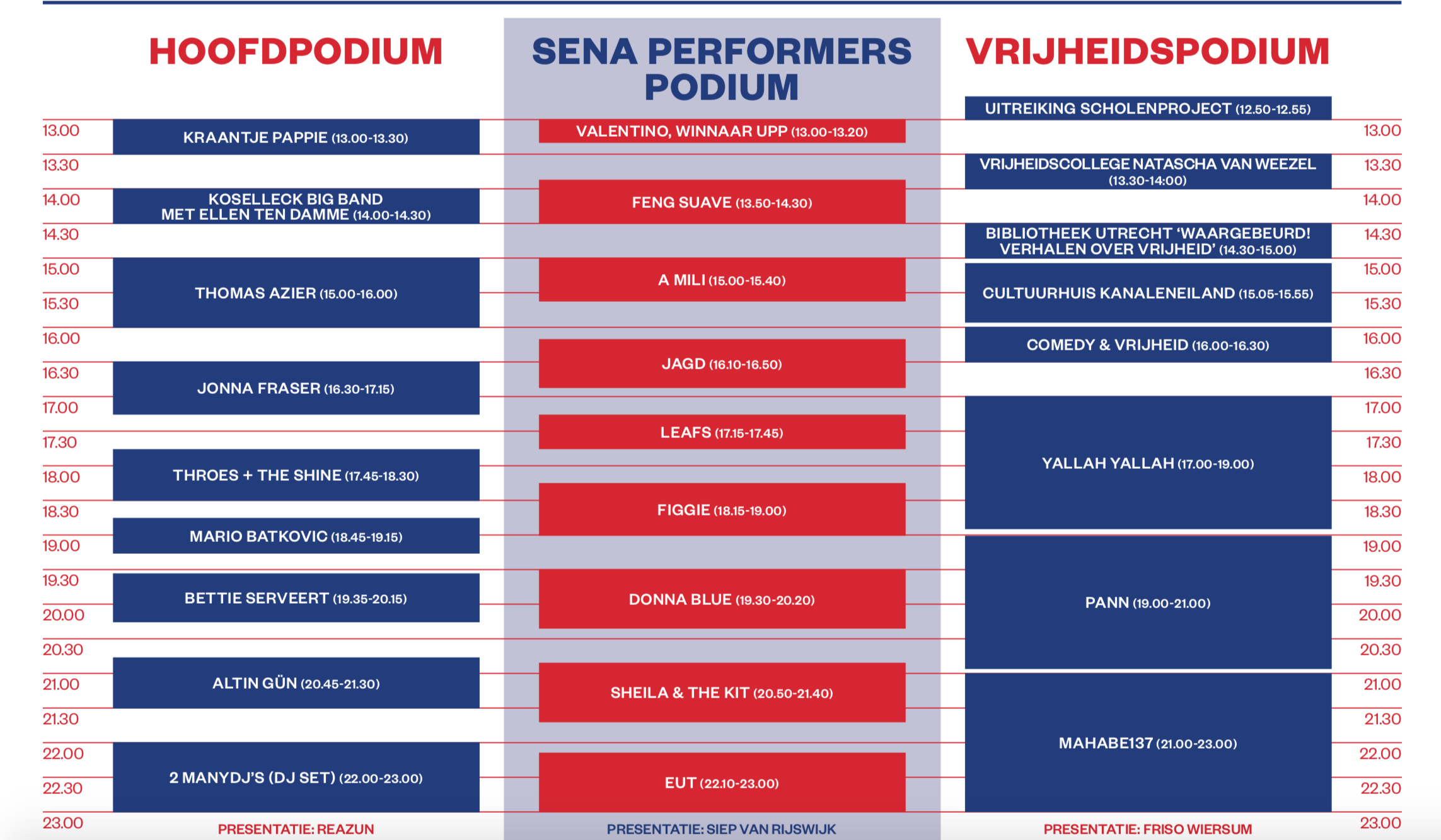 Het is de organisatie van Bevrijdingsfestival Utrecht weer gelukt om een leuk en gevarieerd programma in elkaar te zetten. Zo kun je gaan kijken naar de Hip Hop van Fresku en The Coup, lekker mee te brullen met de klassiekers van Het Goede Doel of speciaal naar de mannen van Chef’s Special komen die als 'Ambassadeurs van de Vrijheid' het festival per chinook helikopter aan zullen doen. Nog geen idee welke optredens je wil gaan bekijken? Beluister dan onze playlist in Spotify.